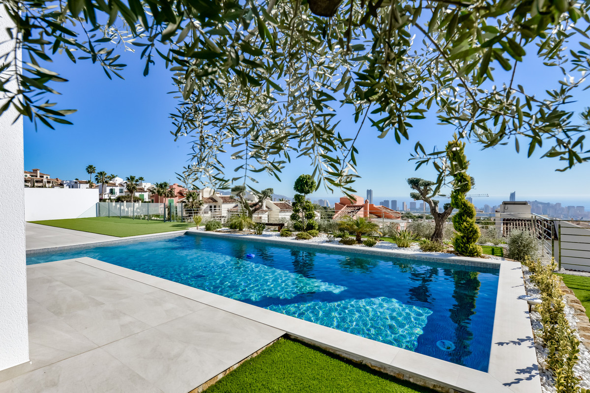 When we go up to the main floor by 3 access ways we see a living room of 130 m2 with double light, open kitchen, guest toilet, panoramic sea views, and swimming pool of 54 m2 of laminate, a beautiful garden and 2 large covered terraces.