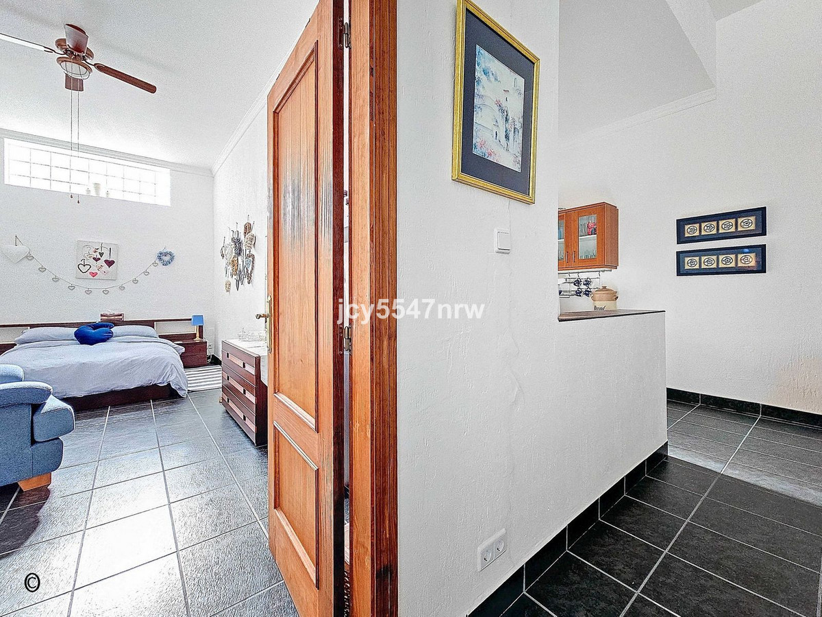 From the garden, the lower floor of the villa is accessible; not only is there a large garage (for two cars and plenty of storage space), but also a fully equipped, spacious apartment with high ceilings. Guests can enjoy complete privacy here, with their own living room, kitchen, bedroom, and bathroom.