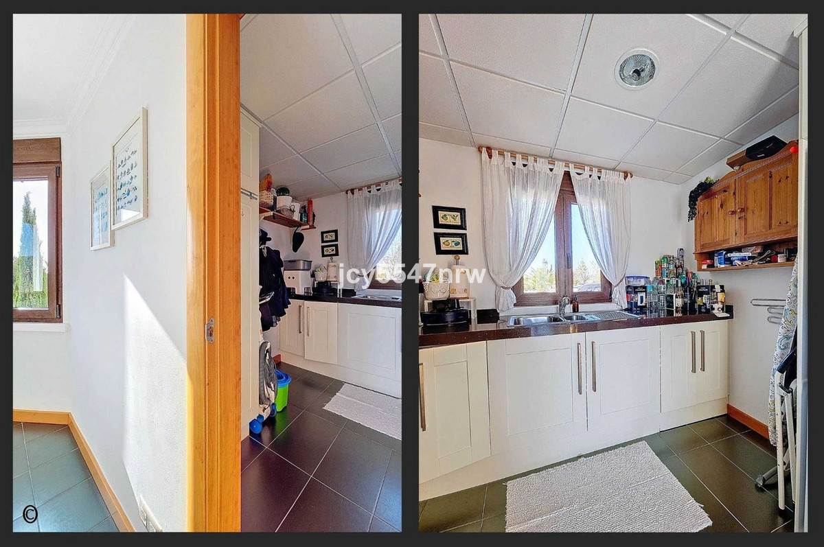 From the hallway, there is also access to the luxurious kitchen, which is fully equipped and provides direct access to the terrace. The terrace spans the entire length of the villa and offers various cozy spots to enjoy both the sun and the shade while taking in the views. How wonderful it is to enjoy a meal on the terrace, overlooking the village of Pinoso and the landscape of olive groves, almond trees, and vineyards.