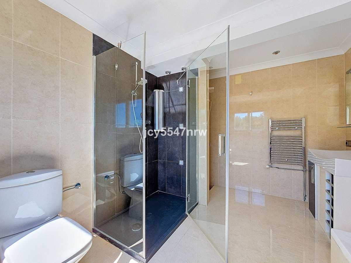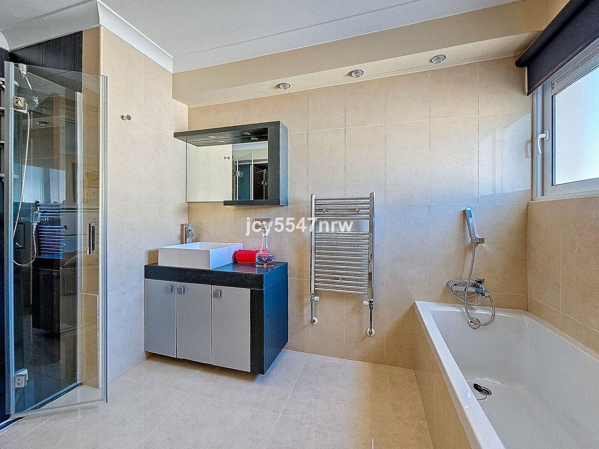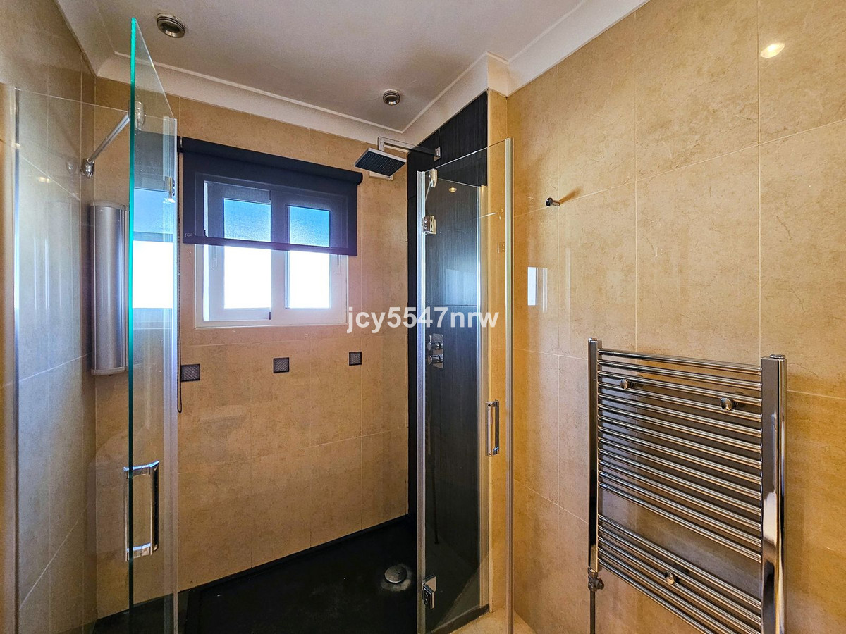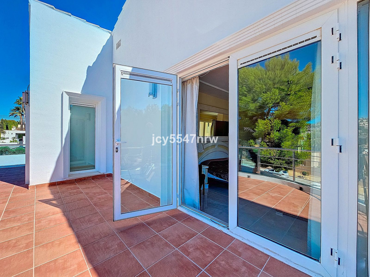 A stylish staircase leads you to the upper floor, where you will find additional storage space and access to a narrow balcony that wraps around the rear and side of the villa. This balcony is accessible from two bedrooms. Here, you will also find a bedroom with built-in wardrobes and an ensuite bathroom with a bathtub, as well as a bedroom with built-in wardrobes and an ensuite bathroom with a shower. This bedroom also provides access to a generous terrace.