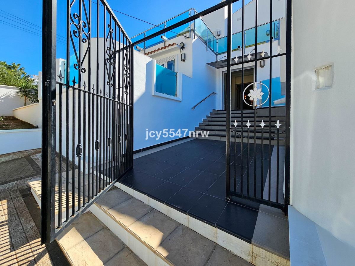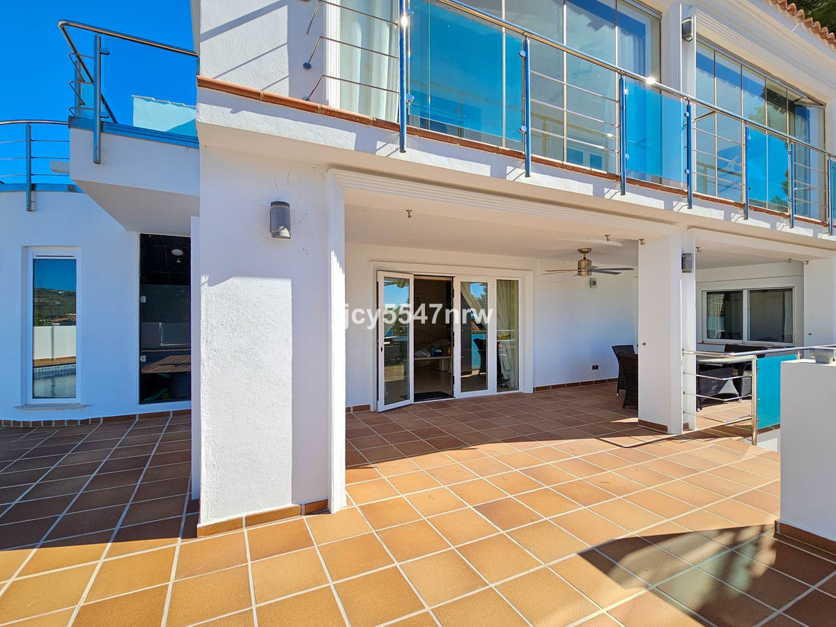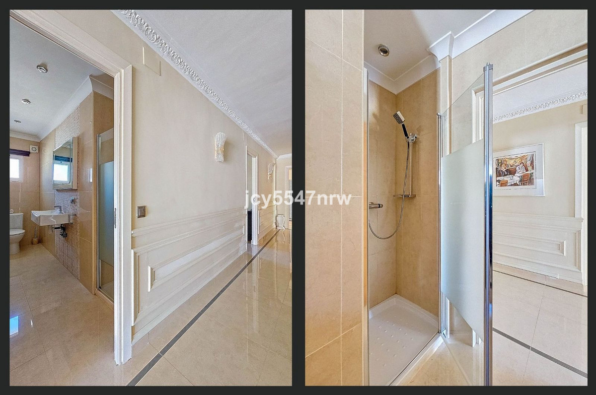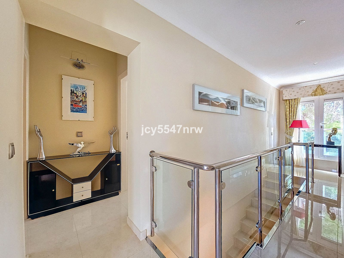 A stylish staircase leads you to the upper floor, where you will find additional storage space and access to a narrow balcony that wraps around the rear and side of the villa. This balcony is accessible from two bedrooms. Here, you will also find a bedroom with built-in wardrobes and an ensuite bathroom with a bathtub, as well as a bedroom with built-in wardrobes and an ensuite bathroom with a shower. This bedroom also provides access to a generous terrace.