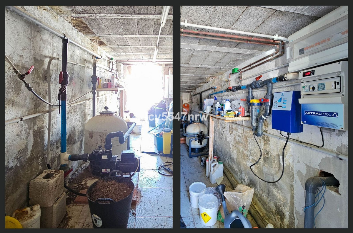 The villa is spread over two floors. Beneath the swimming pool, there is a spacious area that can be converted into an outdoor kitchen or fitness room, depending on your wishes. Additionally, there is a private parking area accessible from the street side and a garage located beneath the pool terrace, accessible from the other side. Below the pool and terrace, you will find a large technical room for the pool installations, and at the rear of the villa, there is also a smaller technical room.