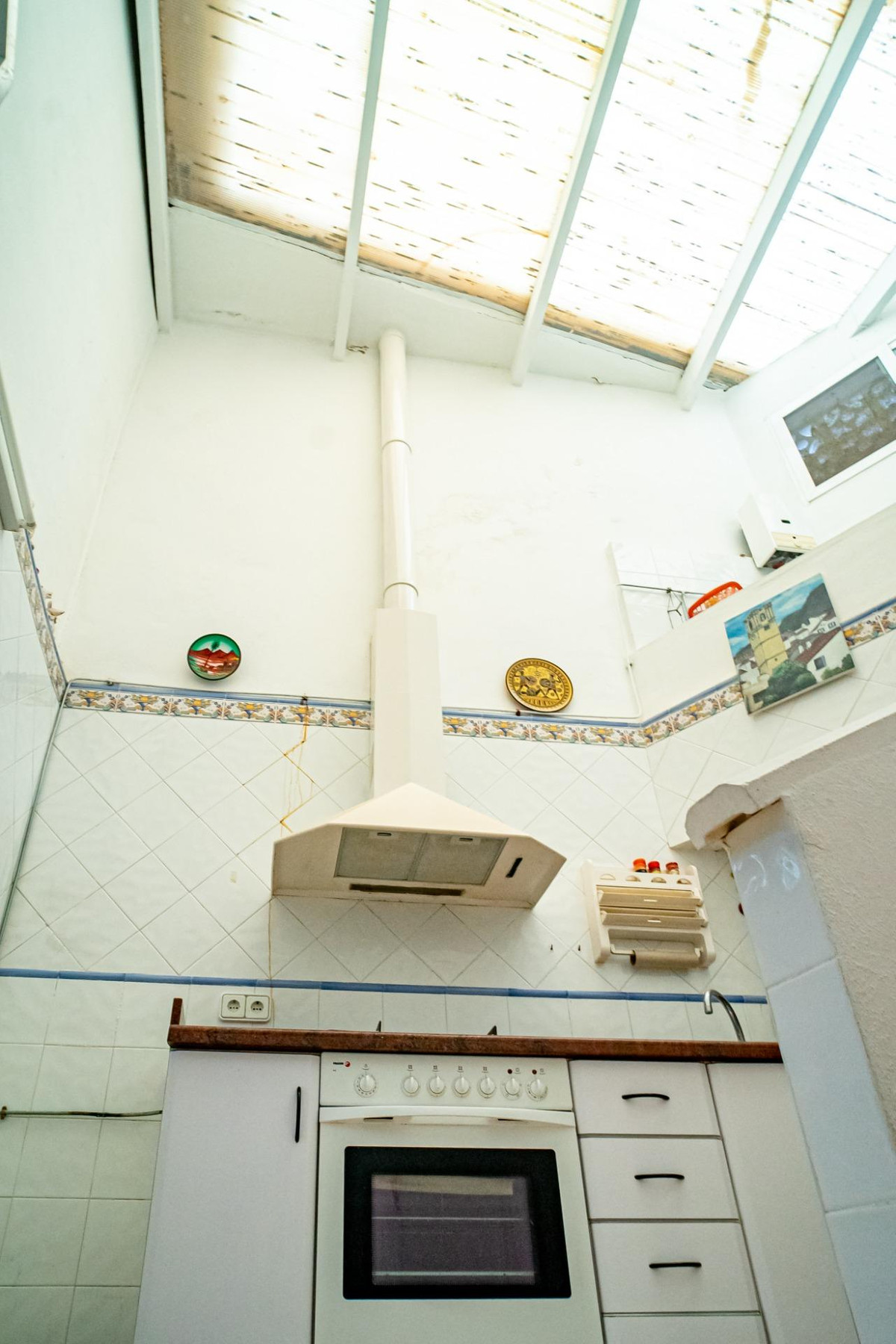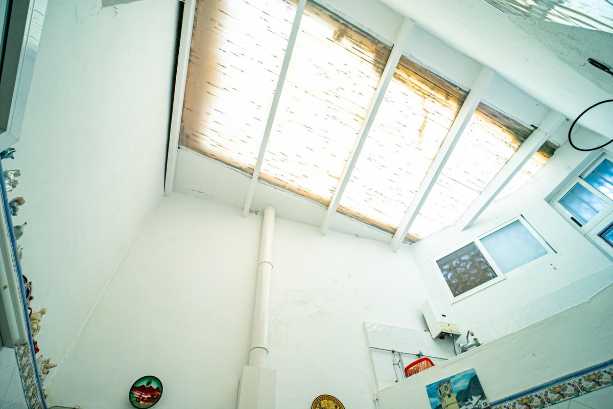 The house has 3 floors and entrance from two streets. On the first floor there is a small kitchen, 2 bedrooms, store room, bathroom, lounge/dining room with fireplace. In addition there is a patio with a roof on the third floor and here is the main kitchen.