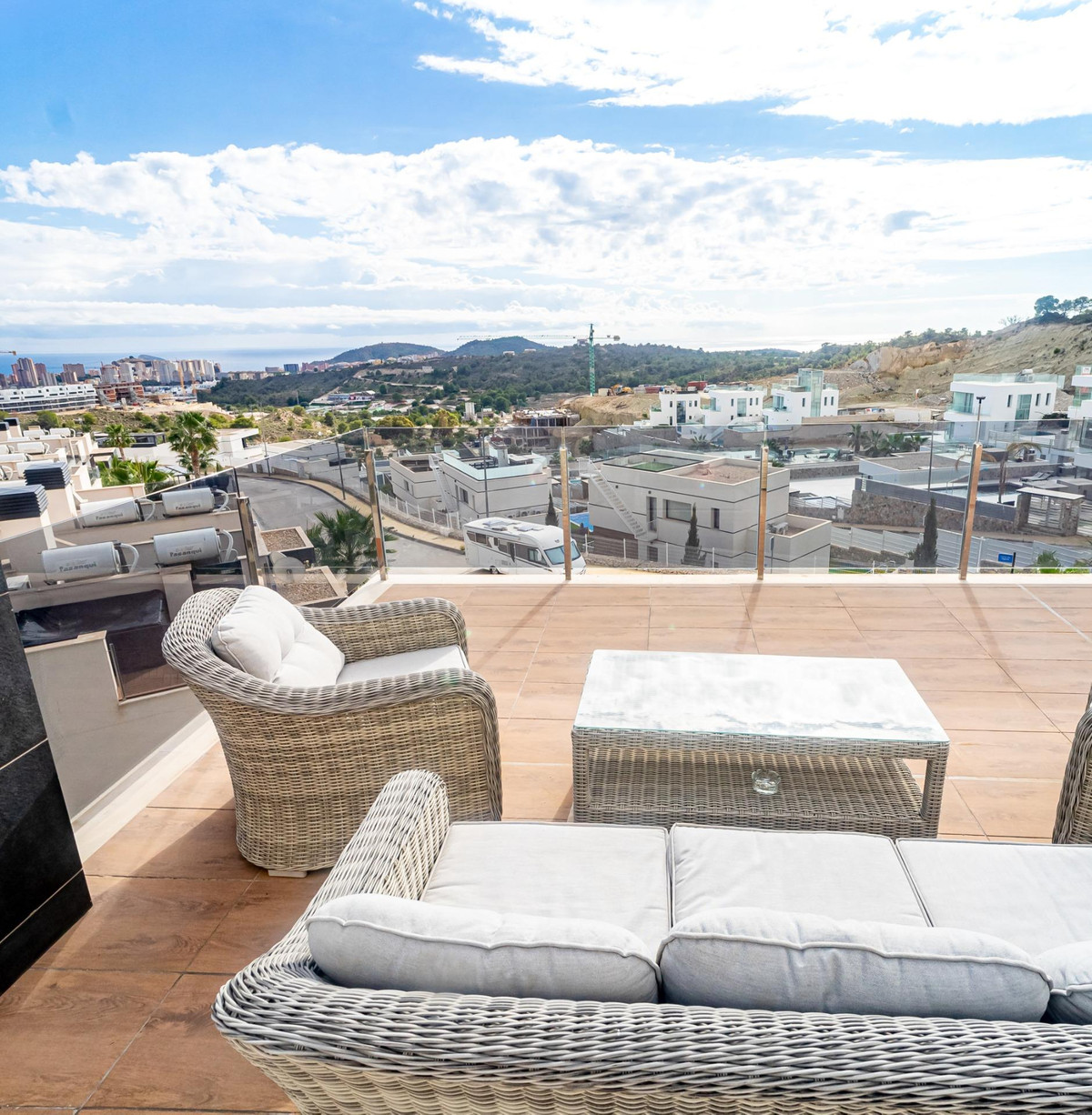 This corner penthouse is located in the new area of Finestrat. The apartment has plenty of natural light and is in very good condition. It features 3 bedrooms, one of which has a small balcony, two bathrooms with underfloor heating, (one of them is an en-suite bathroom), open-plan kitchen, and living room with access to a balcony with a storage room and to a 90 m² solarium. The terrace enjoys sunlight all day, has electricity and water supply, a storage room for the washing machine, and impressive mountain and sea views. The water is heated by solar panels, and the apartment has air conditioning for both cooling and heating. A parking space is included in the price, located in front of the building.