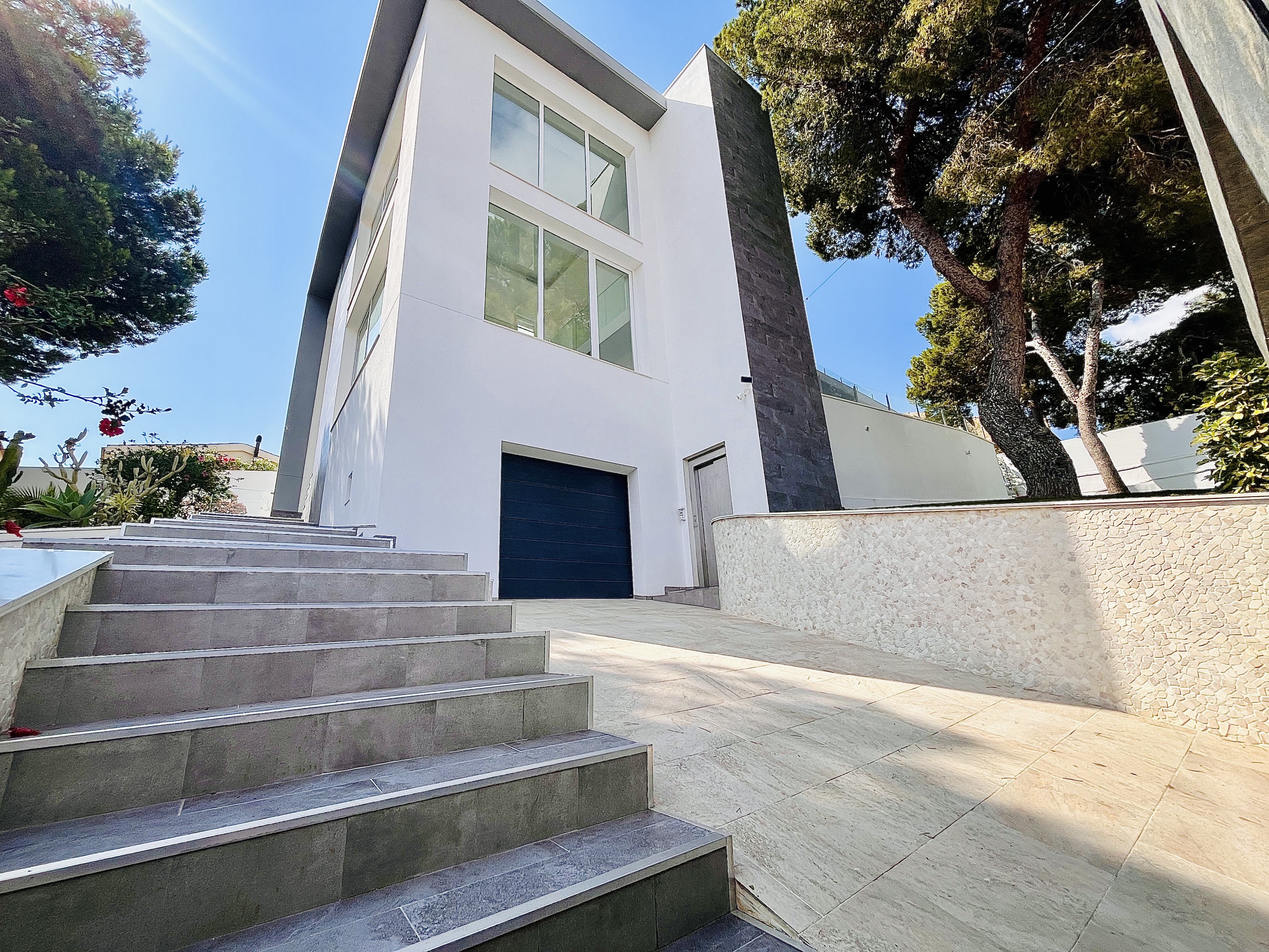 The villa offers 286m² of beautifully maintained living space distributed across two floors, with a private solarium and the convenience of an internal elevator connecting the garage to every level of the home. The ground floor welcomes you with a bright, spacious living room featuring soaring ceilings, expansive windows that frame the natural surroundings, and a cozy fireplace. A fully equipped independent kitchen complements the main living areas, alongside four bedrooms and two bathrooms on this level — ideal for family or guests.