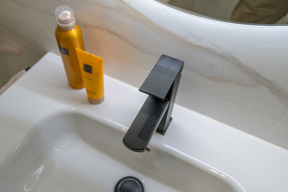 There are three bedrooms, all with built-in wardrobes and large enough for double beds. Two fresh, modern bathrooms with marble-look tiles, black accents, and storage-friendly vanities, plus a separate toilet. Everything is well finished—you don't have to do a thing. There's also a separate utility room with a washing machine and boiler.