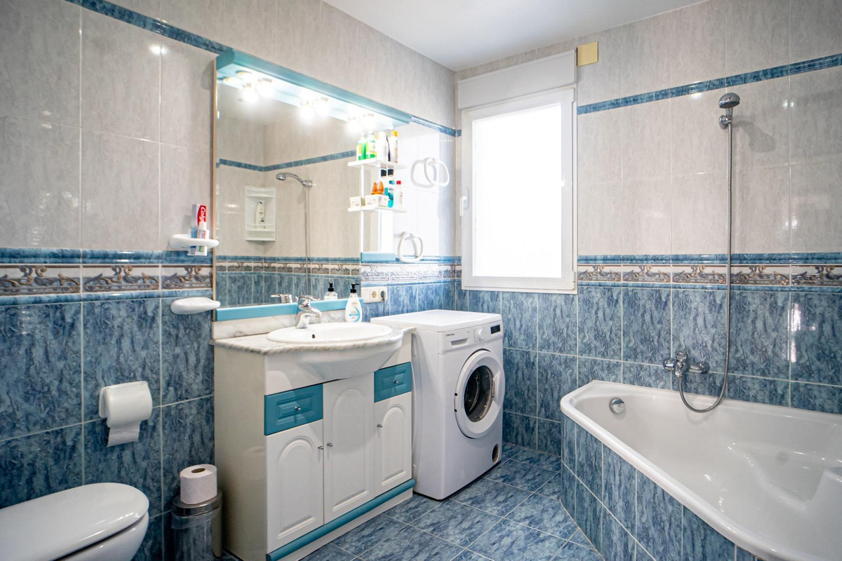 From the large covered terrace, you can access a solarium with panoramic views of the sea and the mountains, as well as the garden area. In this low-maintenance garden, there is a swimming pool with a jacuzzi, both with salt water, a bathroom, and access to the lower floor, the garage, and parking space for two cars. The pool has its own water pump, and there is a water tank for the garden and pool.