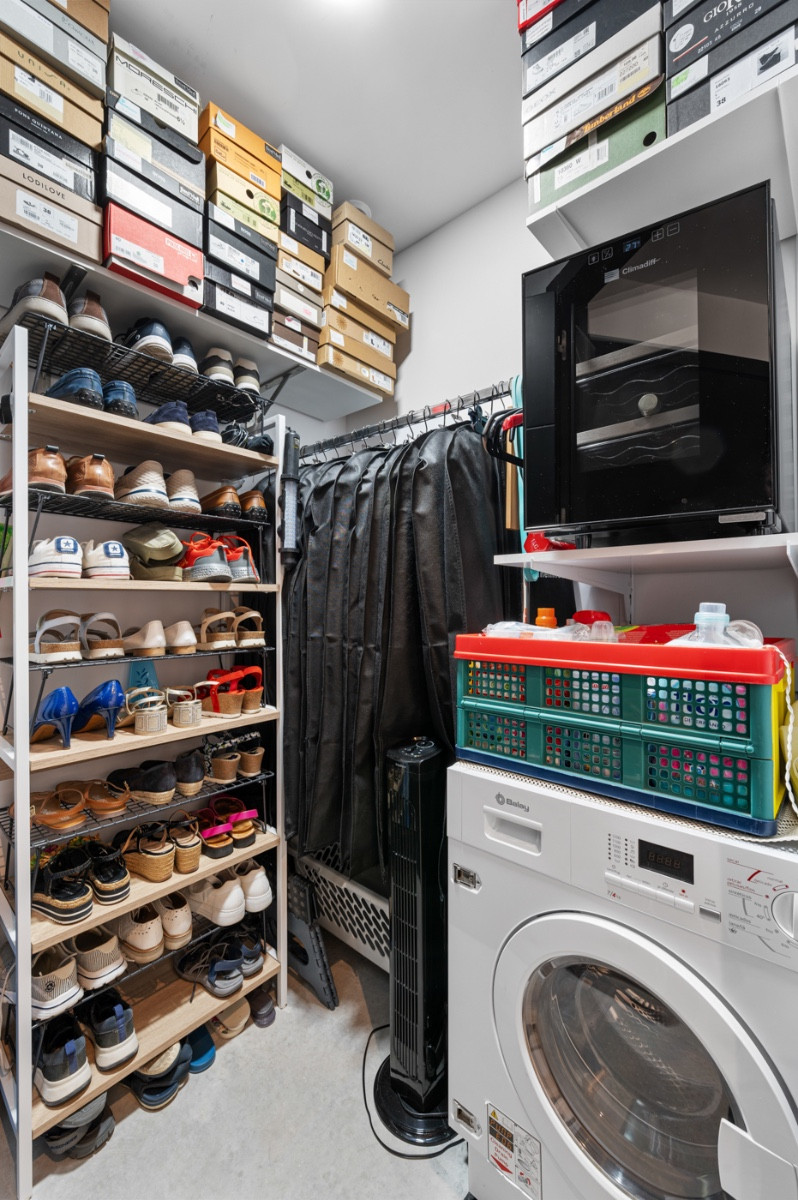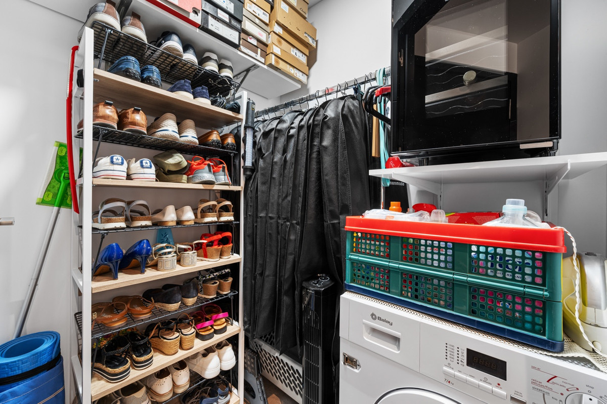 The L-shaped layout optimizes space and functionality. The apartment also includes an entrance hall, separate laundry area, storage room, and air conditioning.