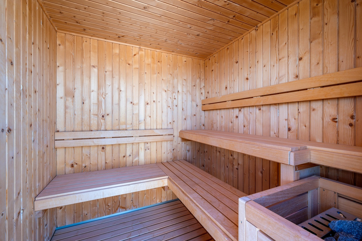 The rooftop features a communal area with a 3 × 8 m outdoor pool, sauna, open-air gym, relaxation zone with loungers, and an outdoor kitchen with barbecue.