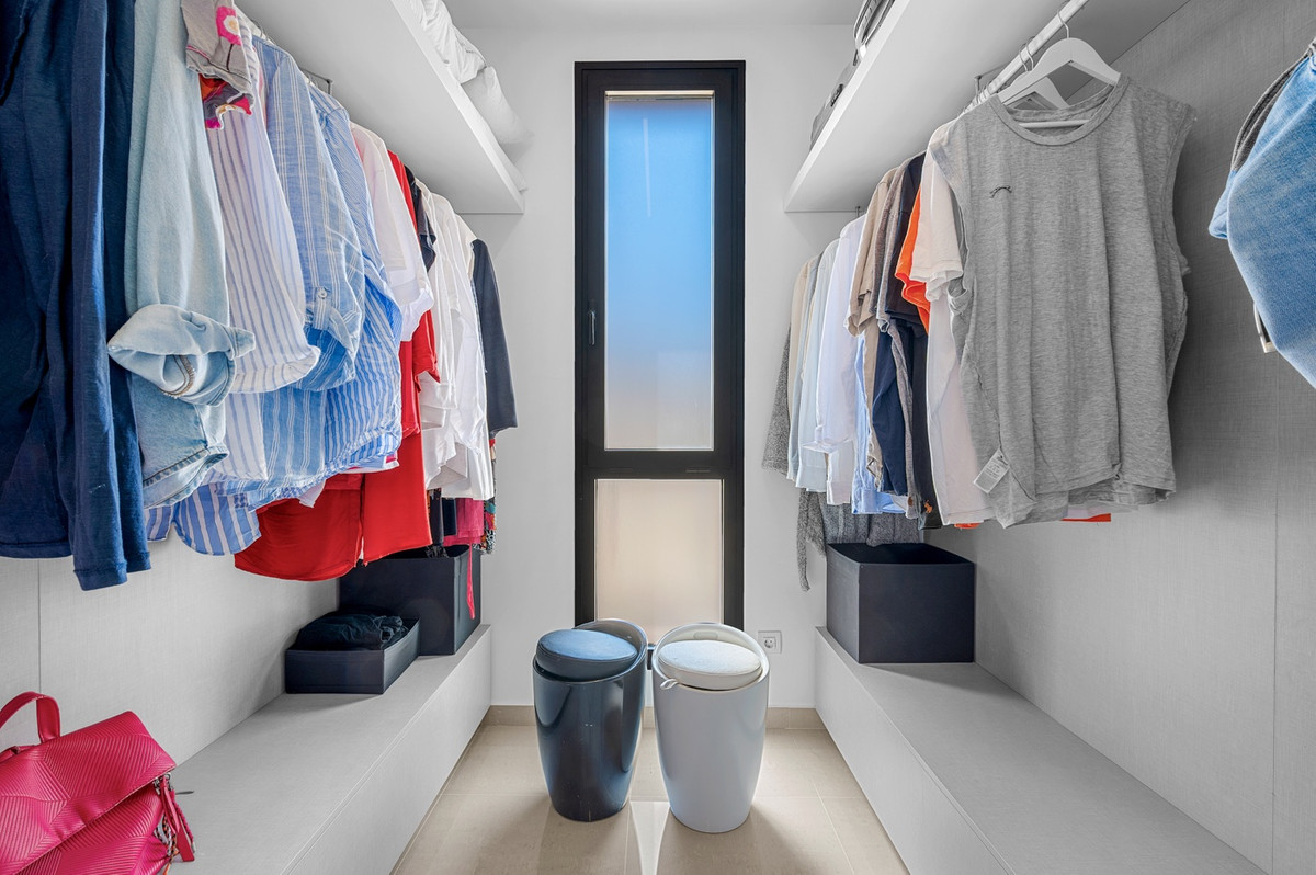 Upstairs, the primary suite includes a walk-in closet and access to a private balcony, while two additional bedrooms with built-in wardrobes complete the upper level. A fourth bedroom is located on the ground floor, ideal for guests or flexible use. Additional conveniences include a separate laundry room, a storage area, and private parking on the plot. With its thoughtful layout, quality finishes, and excellent orientation, this home presents a modern lifestyle just minutes from the sea.