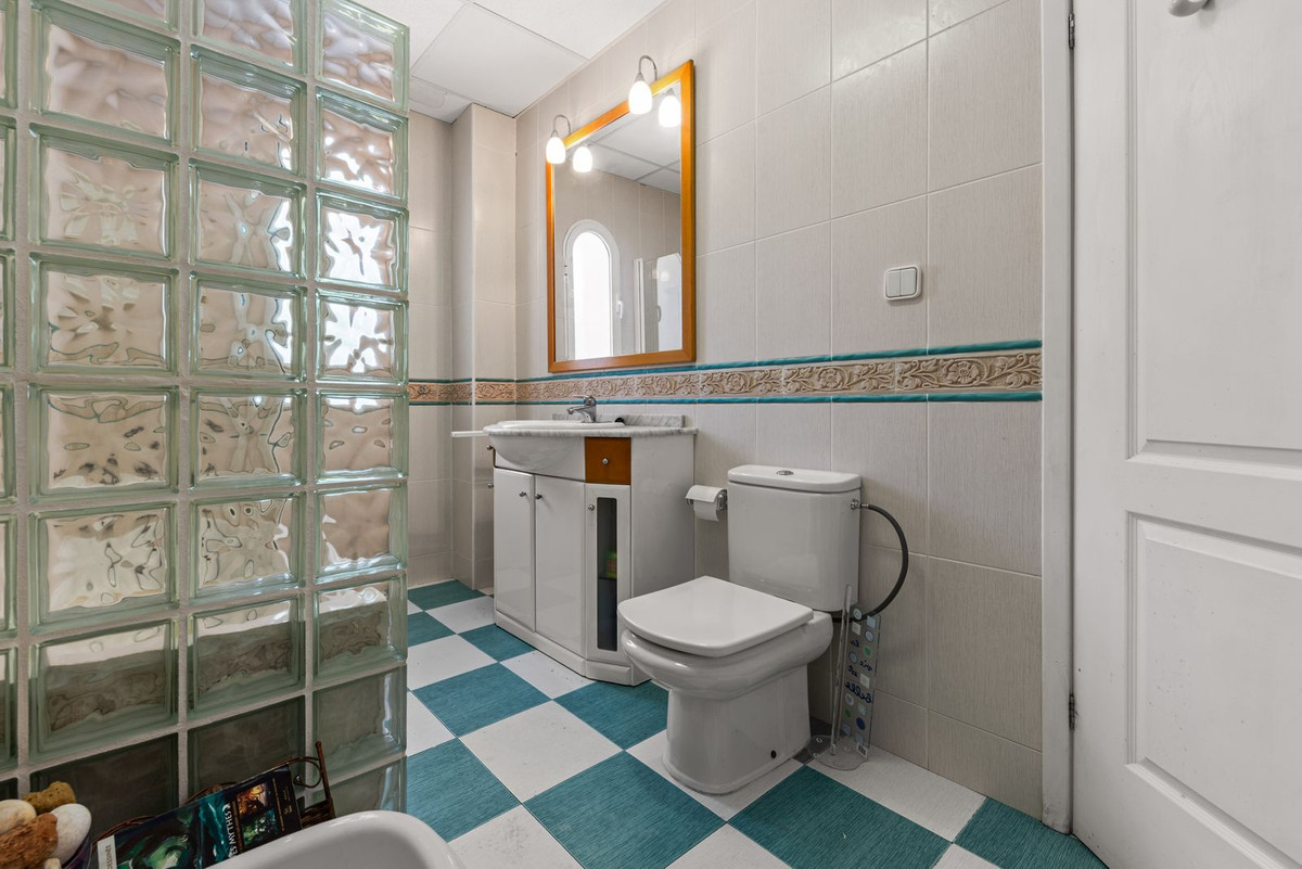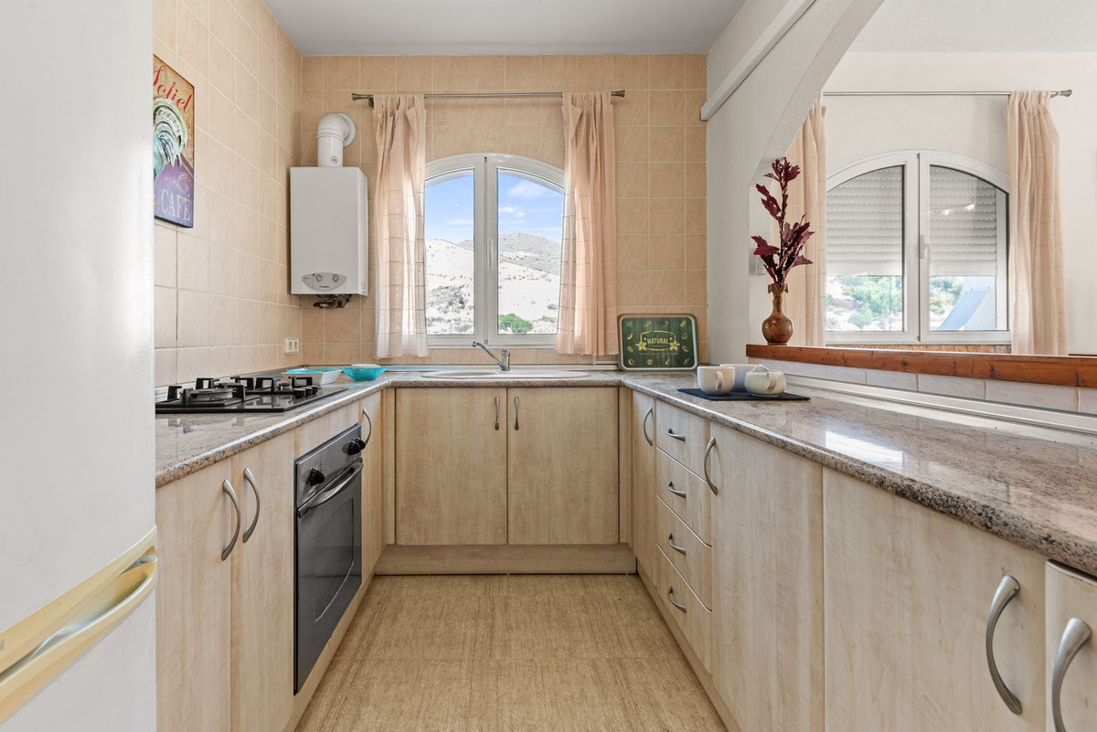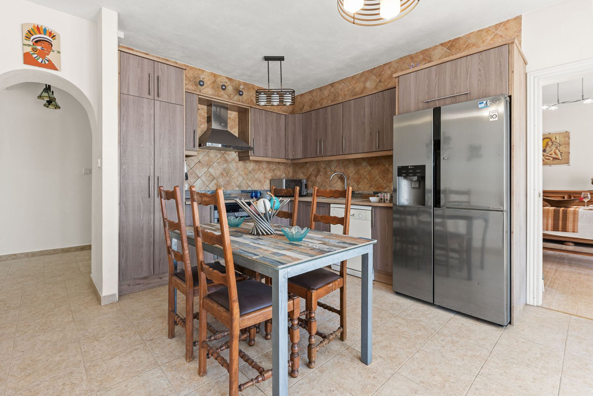 A welcoming entrance hall opens into the lounge, featuring an arched window frontage with views over the swimming pool. An archway leads to the kitchen and dining area, which opens directly onto a spacious open, arched terrace of approximately 35 m² — ideal for al fresco dining. Views of the sea from the lounge and terraces on this floor.