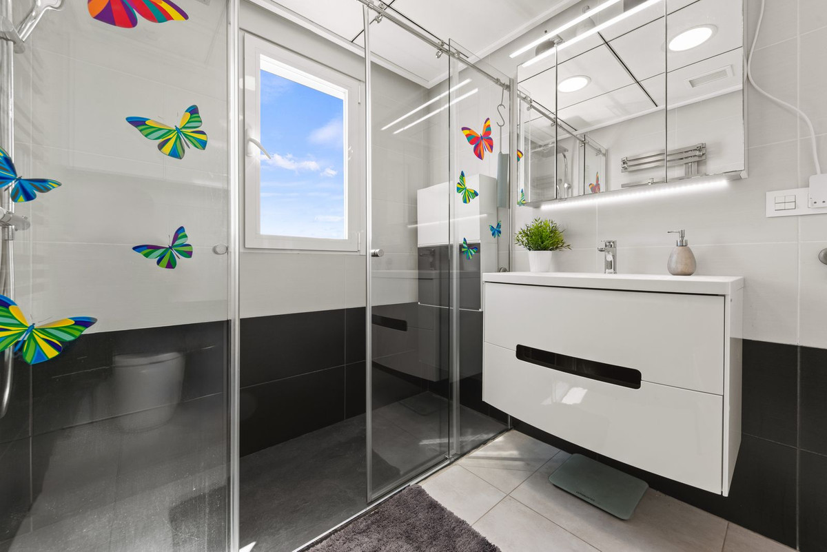 Inside, the entrance hall opens to a bright lounge-dining room, seamlessly connected to a glazed-in south-facing terrace. The elegant white kitchen is equipped with high-end appliances. The apartment also offers a family bathroom, a separate WC, and three double bedrooms.