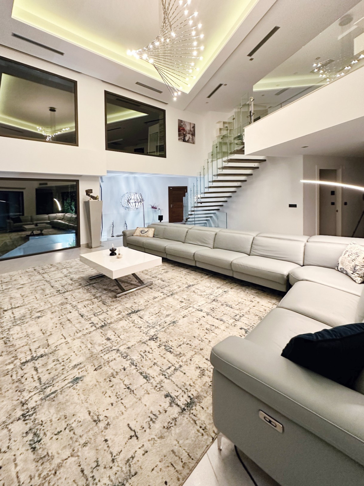 Elevate your lifestyle in this breathtaking 525 square meter masterpiece, where luxury meets modern living. This architectural marvel unfolds across three meticulously designed floors, offering an unparalleled living experience. The heart of the home showcases a magnificent open-concept living area, bathed in natural light from floor-to-ceiling windows. A stunning floating staircase, adorned with glass balustrades, serves as a sculptural centerpiece, connecting the levels with effortless grace.