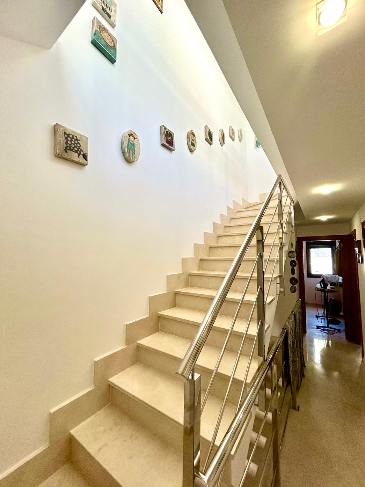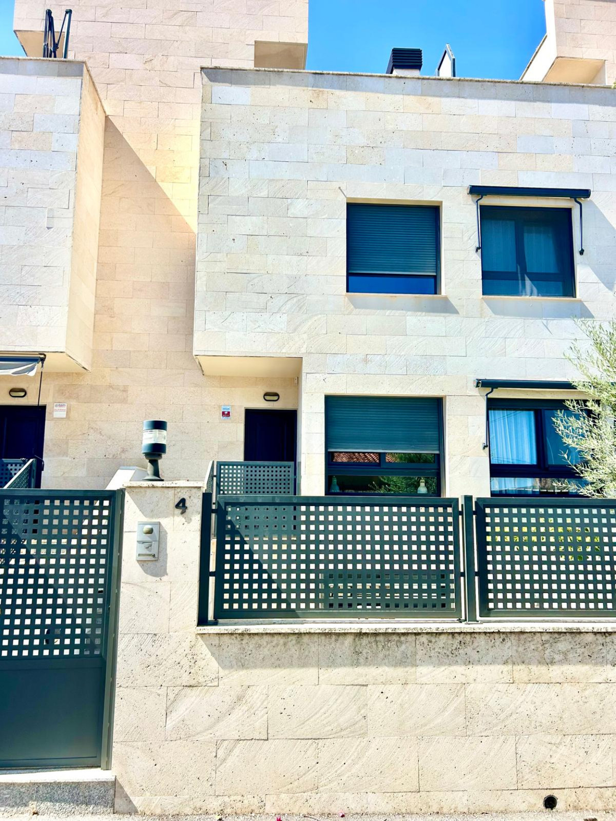 Exclusive 3 bedroom 2 bathroom Townhouse for sale with lift to all floors. This spacious townhouse is situated on a small complex within walking distance of Calpe town centre and all amenities, the property enjoys excellent views towards the Ifach, mountains and sea. We enter the property into the open plan living/dining room with inox and marble feature staircase leading to first floor and also the basement garage, doors lead to a good sized family bathroom and fully fitted separate kitchen with a range of fully fitted units and appliances, a single door leads out onto the rear garden and terrace area which gives access to the large communal swimming pool and private visitor parking area. From the living room stairs and lift lead to the lower basement level with large double garage with electric door, leading out into the main garage area. It is possible to access every floor via the lift from the garage. The first floor of the property consists of 2 double bedrooms with the master have in ensuite bathroom, a single bedroom and a family bathroom, from this level stairs and lift take us to us to the top floor solarium which gives amazing views both to the coast and also inland mountain views, there are two large terraces with water and electric connections and also there is a waiters kitchen with fridge and sink. Outside to the front of the property there is a gravel garden area and to the rear another garden and terrace area which has access to the kitchen, in addition to the private garage, there is further secure parking, a large communal pool with terrace and an area set aside with picnic tables.