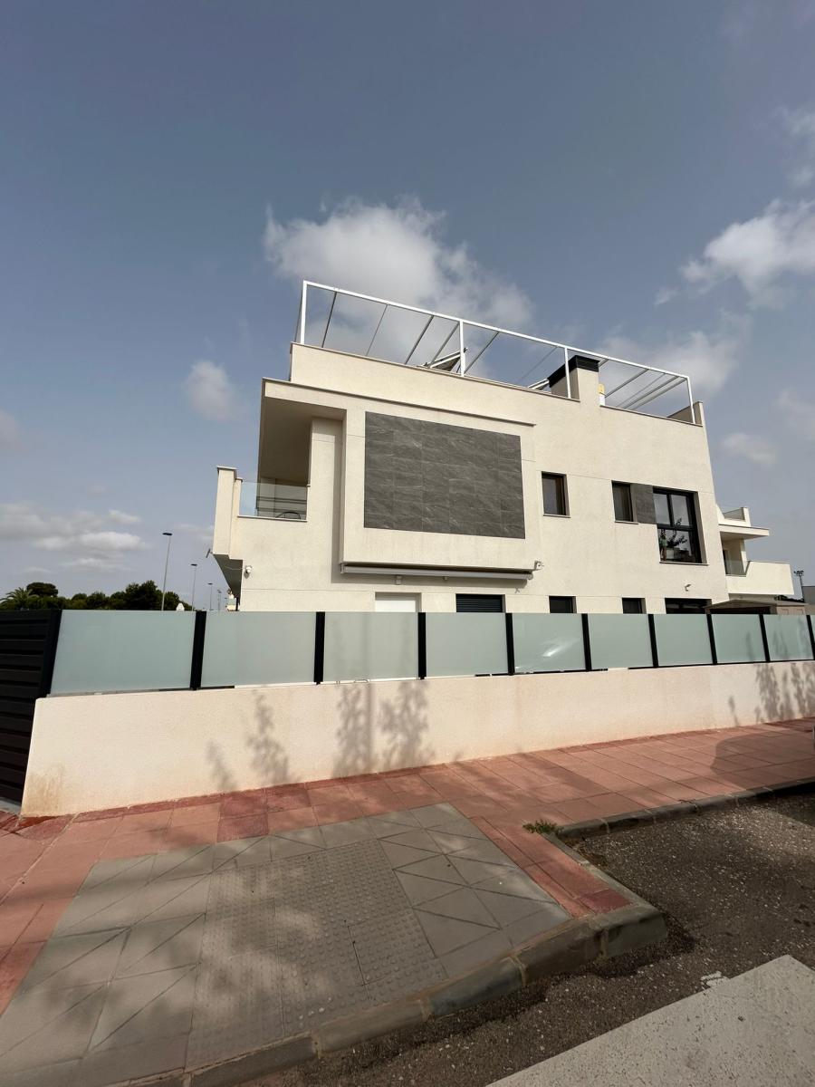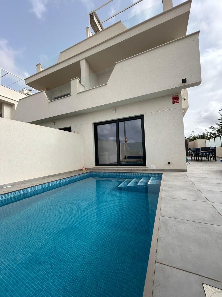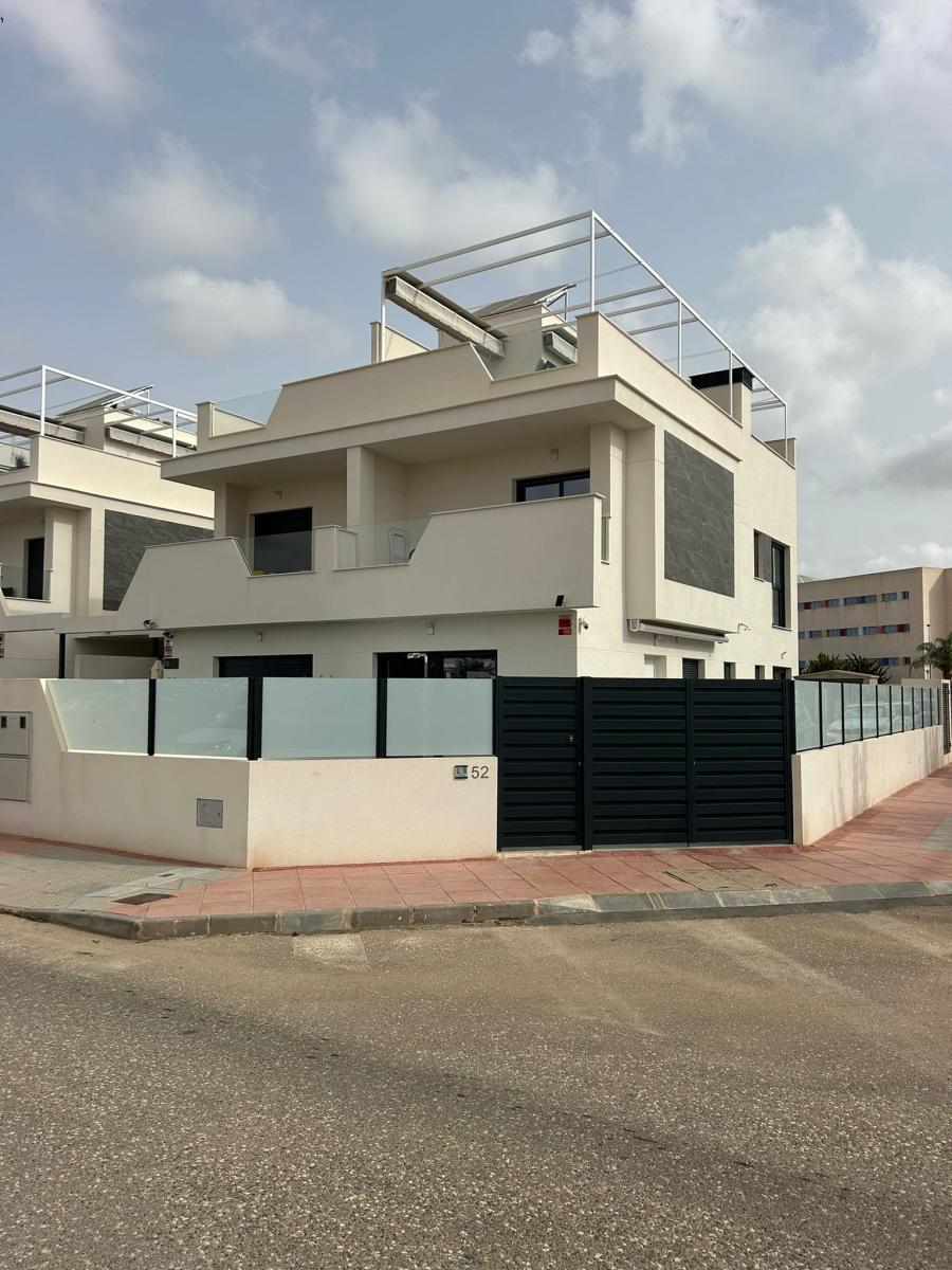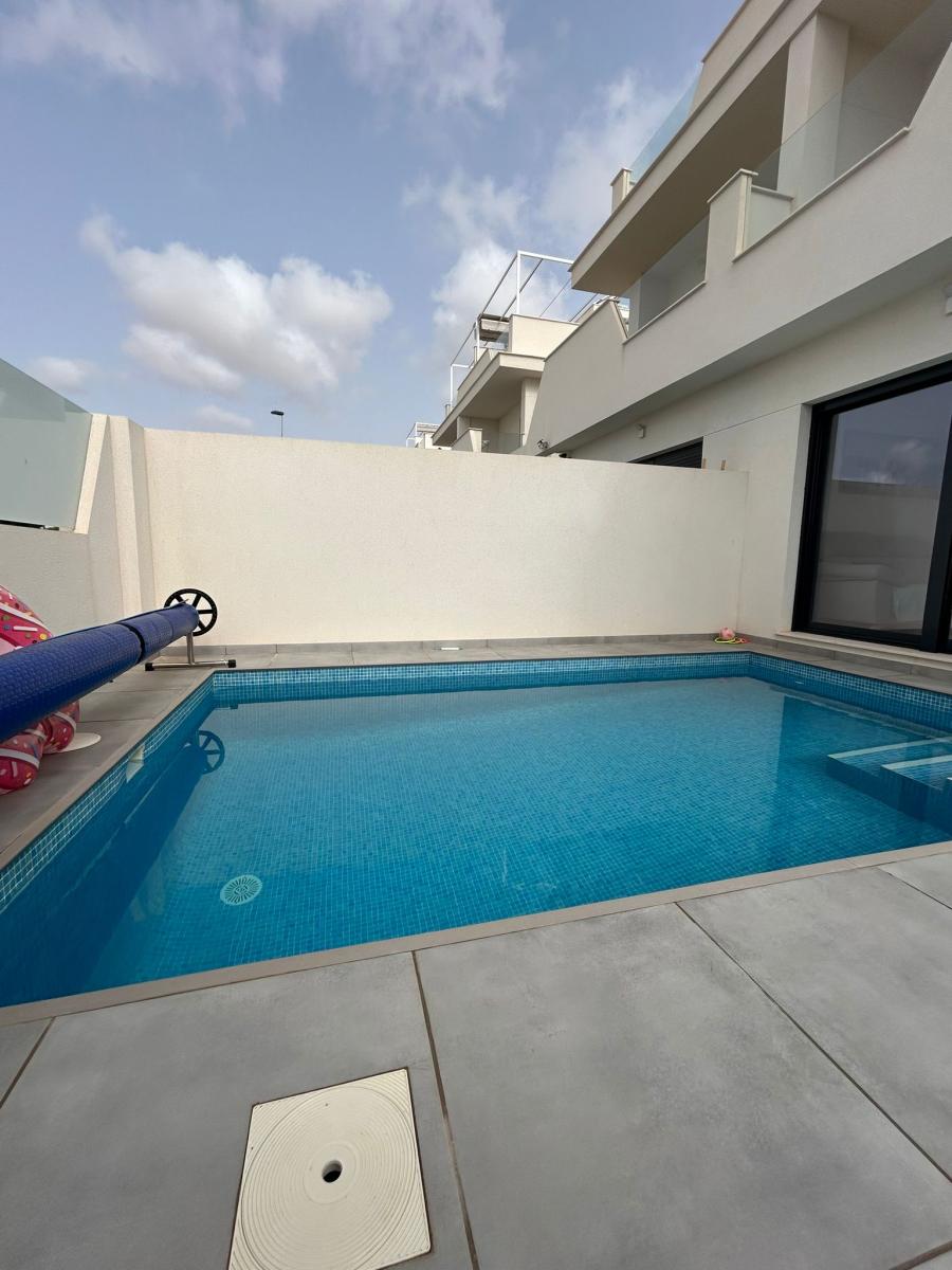 3 bedroom, 2 bathroom semi-detached south/east facing villa with private pool and private solarium in Santiago de la Ribera.Large plot with gated driveway leading to a large front terrace. The large swimming pool is to the front of the property and there is plenty of space for dining, sunbathing. The house has a large living room with views to the pool and an modern open plan fully fitted kitchen. Beyond the kitchen is a double bedroom with fitted wardrobes and a door leading to the side terrace. There is also a modern shower room on the ground floorOn the first floor are two double bedroom with fitted wardrobes. The bedroom to the front of the house has access to a terrace. Also on this first floor is a modern shower room. There are stairs from the first floor leading you to your own private roof solarium with outdoor kitchen area. Another amazing outdoor living space.This house is only two years old and will be sold fully furnished.It’s within walking distance to the beach and a short drive to the Dos Mares shopping mall and Pinatar retail park. Murcia airport is about a 30 min drive and Alicante is about a 1 hour drive. There is also some bars, cafes near to the property too. Santiago de la Ribera is a beautiful city on the banks of the Mar Menor. It is the coastal area of the city of San Javier and started as a simple fishing village. It has now become a popular holiday destination, attracting not only Spaniards but also tourists from all over Europe.Santiago has a modern feel, although it still retains its ‘fishing village’ atmosphere. It has a very beautiful promenade with majestic palm trees and 2 kilometers of beautiful sandy beaches. From here you can take a boat trip across the calm waters of the Mar Menor, to the La Manga Strip on the other side. The main shopping area is really in the town of San Javier, but there are some shops in the narrow streets to browse, try it on a Wednesday morning when there is a large street market.