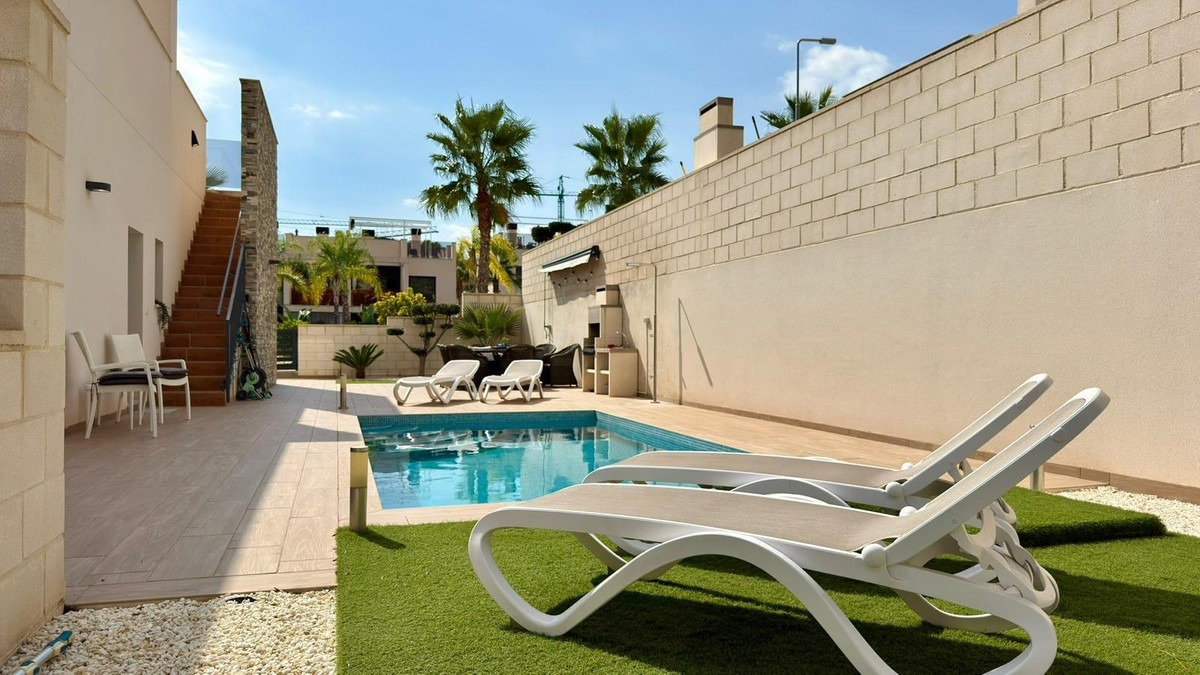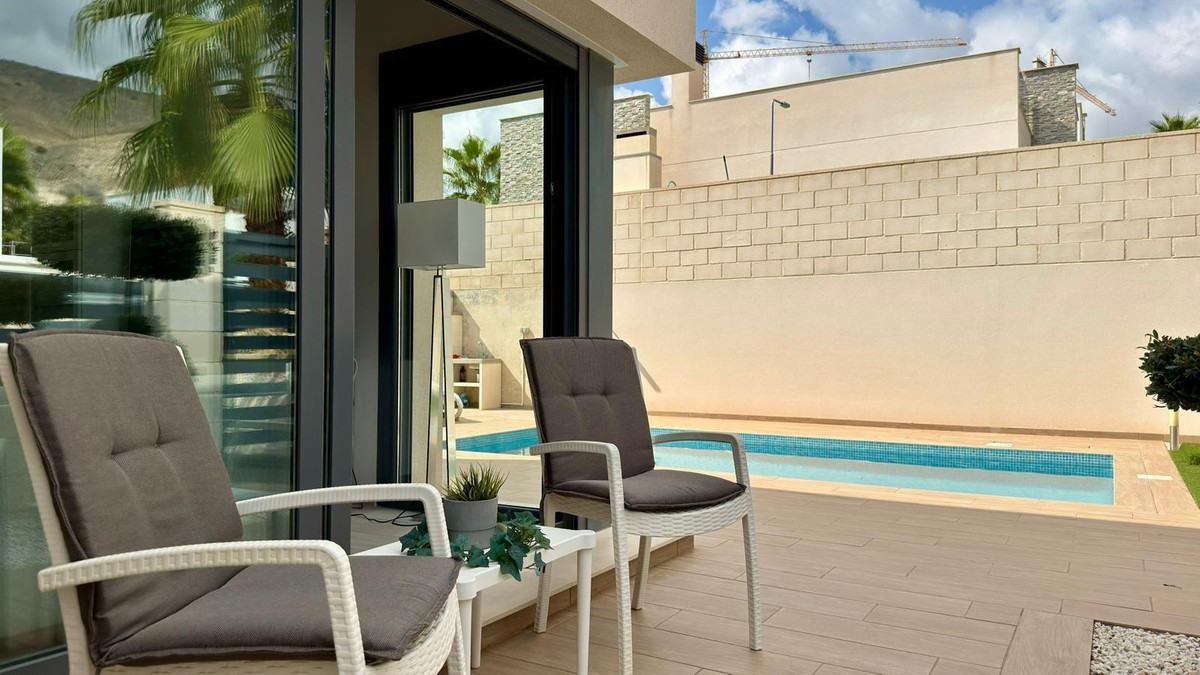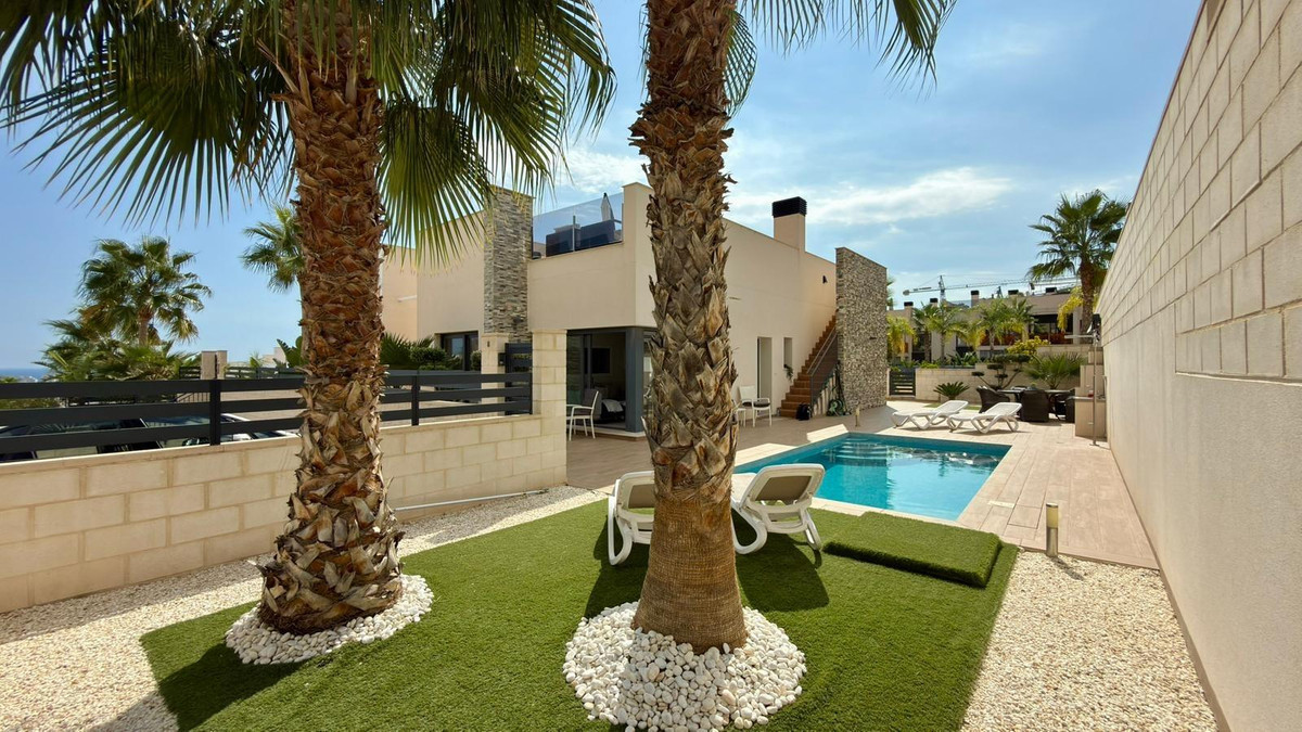 Discover this spectacular detached villa built in 2019, with a constructed area of 109 m², located in one of the most exclusive and peaceful areas of Finestrat, just 5 km from the Mediterranean beaches. This property combines luxury, comfort, and privacy in a paradisiacal environment, ideal for those seeking quality of life and tranquility.The villa features three spacious bedrooms and three elegant bathrooms, offering space and comfort for the whole family. The living room is bright and cozy, perfect for sharing unforgettable moments, while the open-plan kitchen is fully equipped to facilitate modern and functional living.Outside, the villa boasts its private pool, surrounded by a beautiful garden with palm trees and lush vegetation, creating an oasis of relaxation and privacy. Additionally, it has a solarium with stunning sea views, where you can enjoy Mediterranean sunsets and the sea breeze.The property is part of a community that offers a large green area, community pool, jacuzzi, sauna, and a fully equipped gym, combining luxury and wellness in one place.Finestrat is a charming and very quiet place, surrounded by nature and open spaces, ideal for those seeking peace and privacy. Very close by is a golf course, perfect for sports enthusiasts, and just a few minutes from the beaches. The area is safe, pleasant, and offers a relaxed atmosphere without the hustle and bustle of the city.Built with high-quality materials, modern design, and luxury finishes, this villa is ideal for those seeking a sophisticated and exclusive lifestyle, enjoying the sun, nature, and sea views. A unique opportunity to acquire a property that combines luxury, comfort, and a privileged location.Don't miss the chance to live in this gem in Finestrat, a place where every day feels like a dream vacation.