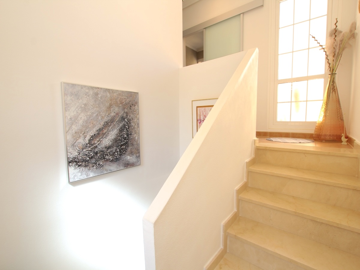An elegant staircase leads to the first floor, where you’ll find two more double bedrooms, both equipped with built-in wardrobes. The main bedroom even has its own private sun terrace!