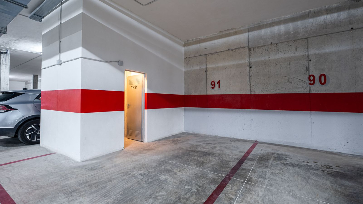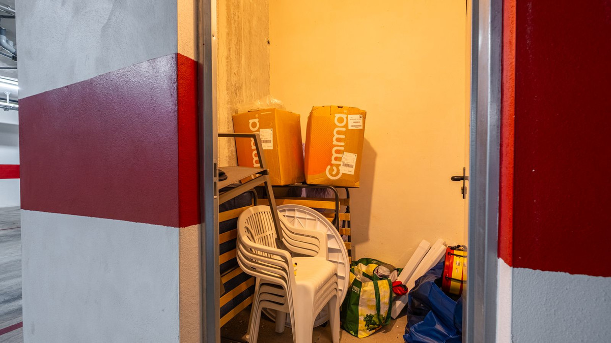 The apartment comes with a private garage space and an additional storage unit, both conveniently accessed by lift or stairs. The community also offers a shared bicycle storage room.