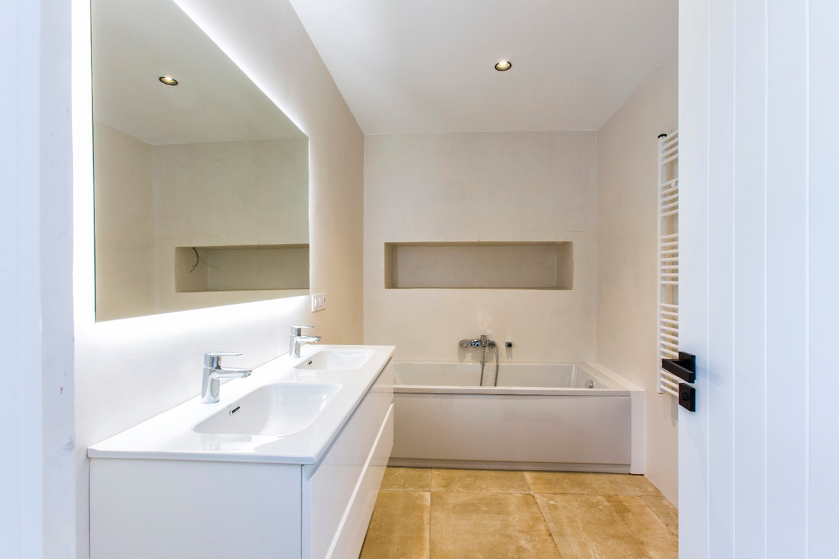 The south-facing villa impresses with its sunny location and uninterrupted sea views. On the ground floor you will find two bedrooms with elegant built-in wardrobes and en suite bathrooms, a guest toilet and a cosy living room with wood-burning fireplace. From here you can enjoy an uninterrupted view of the water, perfect for relaxing in the evening with family or friends.