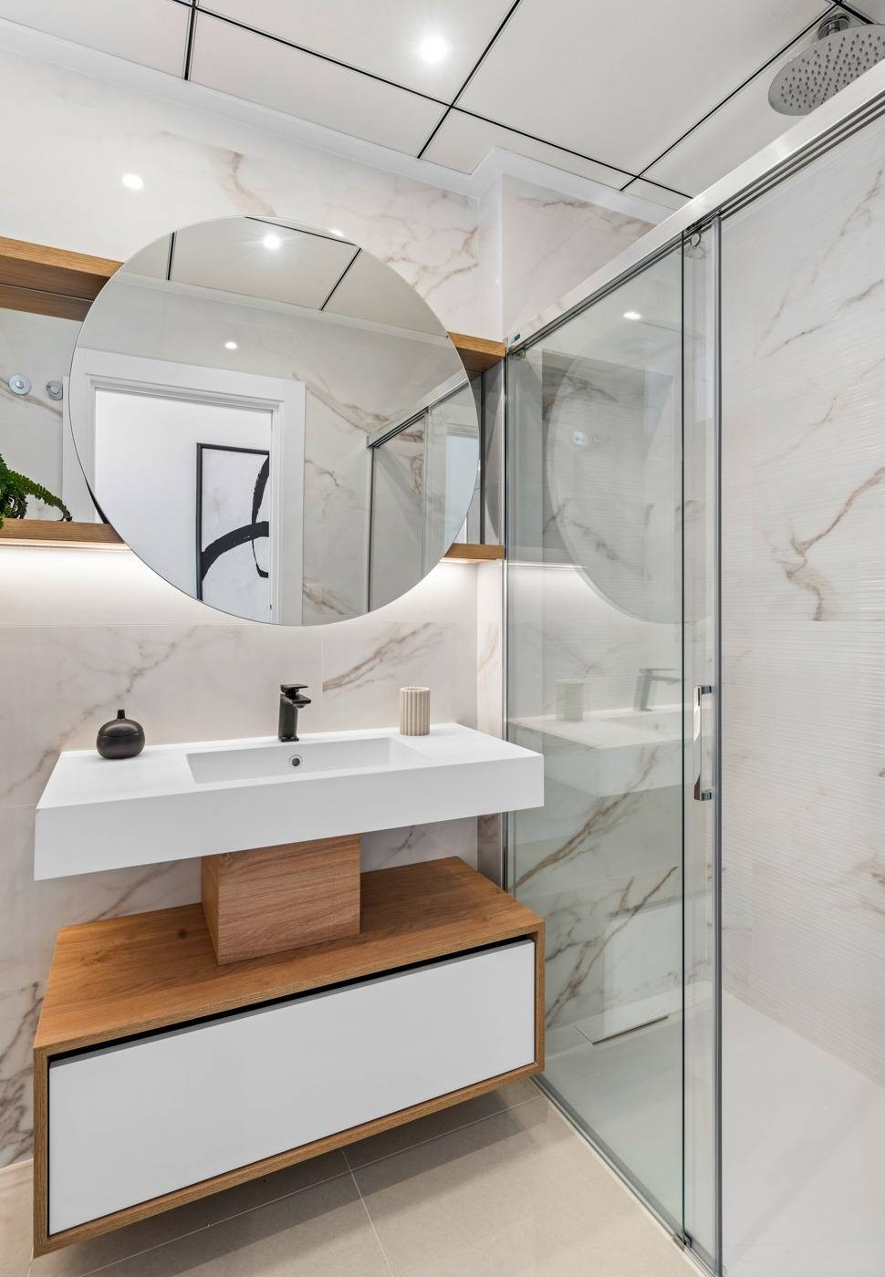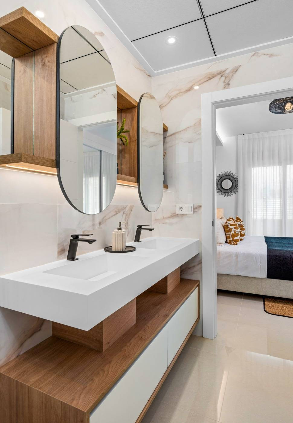 Each bedroom is designed for comfort, with built-in wardrobes and large windows that fill the rooms with natural light. The bathrooms are stylish and contemporary, featuring marble-effect finishes and high-quality fixtures.