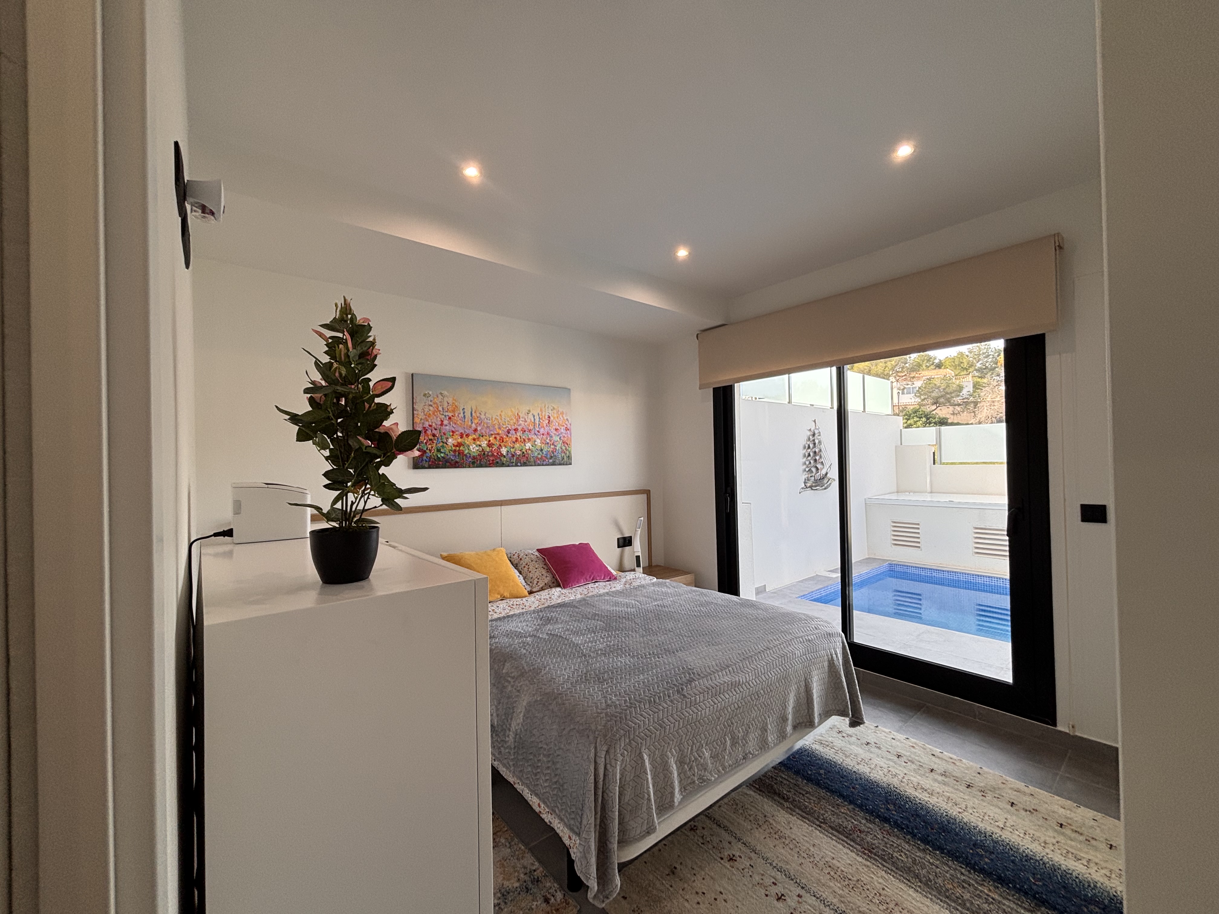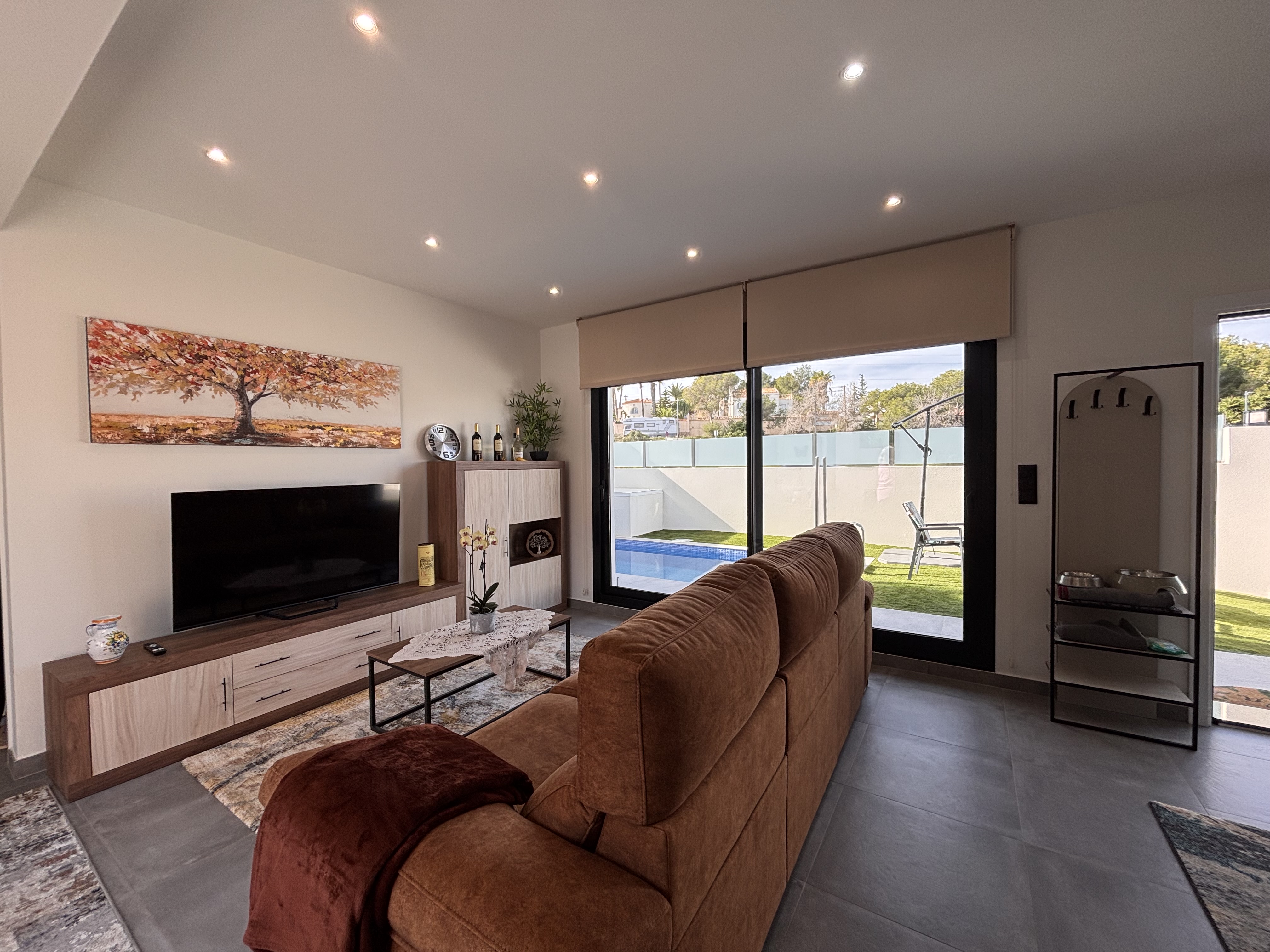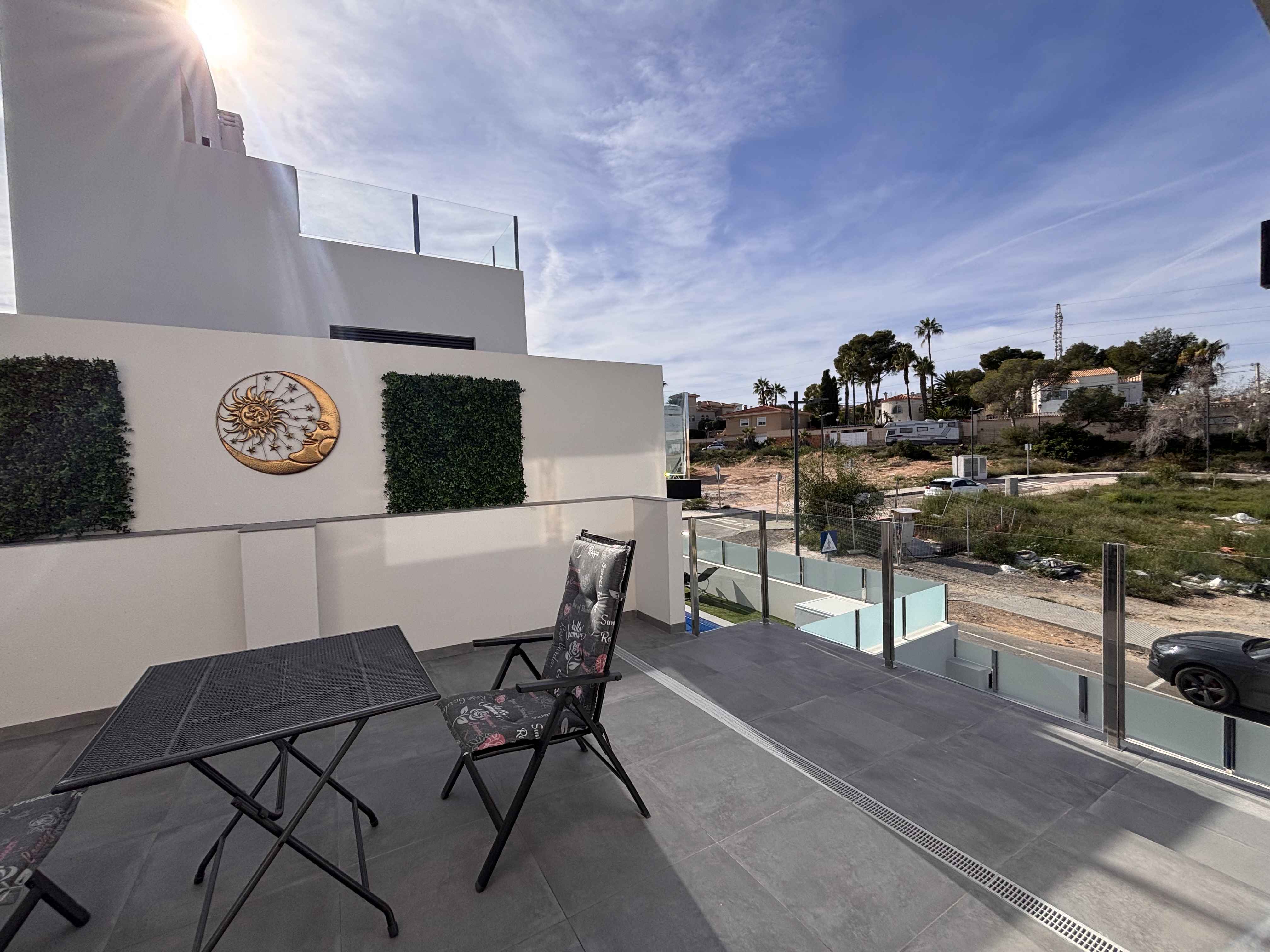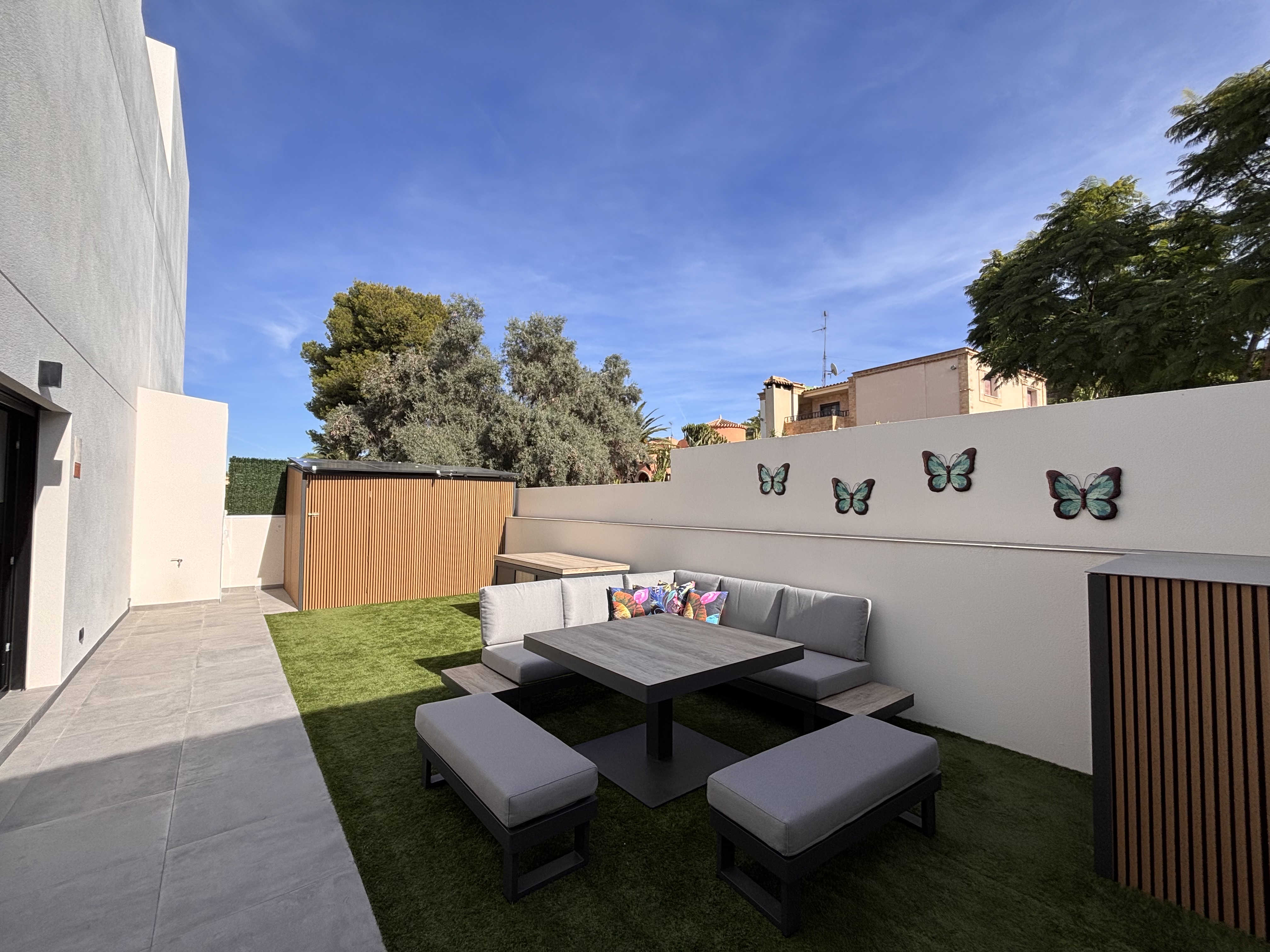 This charming home comes fully furnished and features a private pool, private parking, front and rear garden areas, a bright open-plan kitchen, air conditioning, solar system, electric shutters, 3 terraces and a stunning solarium — ideal for relaxing or entertaining under the Spanish sun.