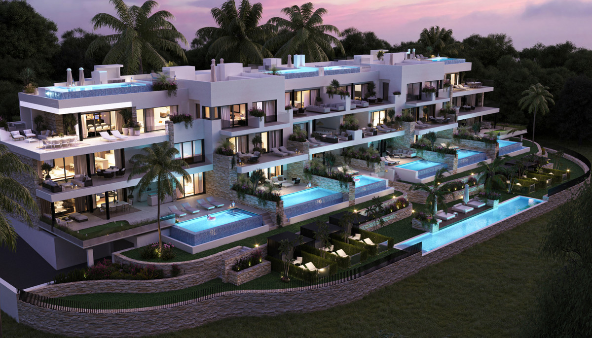 Bl. 25 consists of 16 luxury apartments, while bl. 24 offers 17 apartment. All with huge terrases overlooking the surrounding natural green area. All ground floor and top floor apartments have private swimming pools. The middle floor apartments are all prepared for jacuzzi.