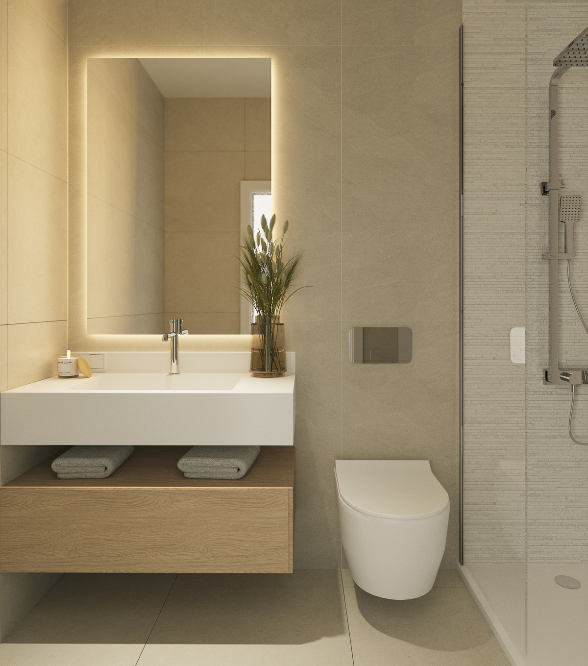 1-, 2-, and 3-bedroom apartments, predominantly 2-bedroom, are designed with spacious living rooms and open kitchens, large windows, and direct access to south-facing terraces that fill every space with natural light. Master bedrooms offer generous space and high-quality finishes.