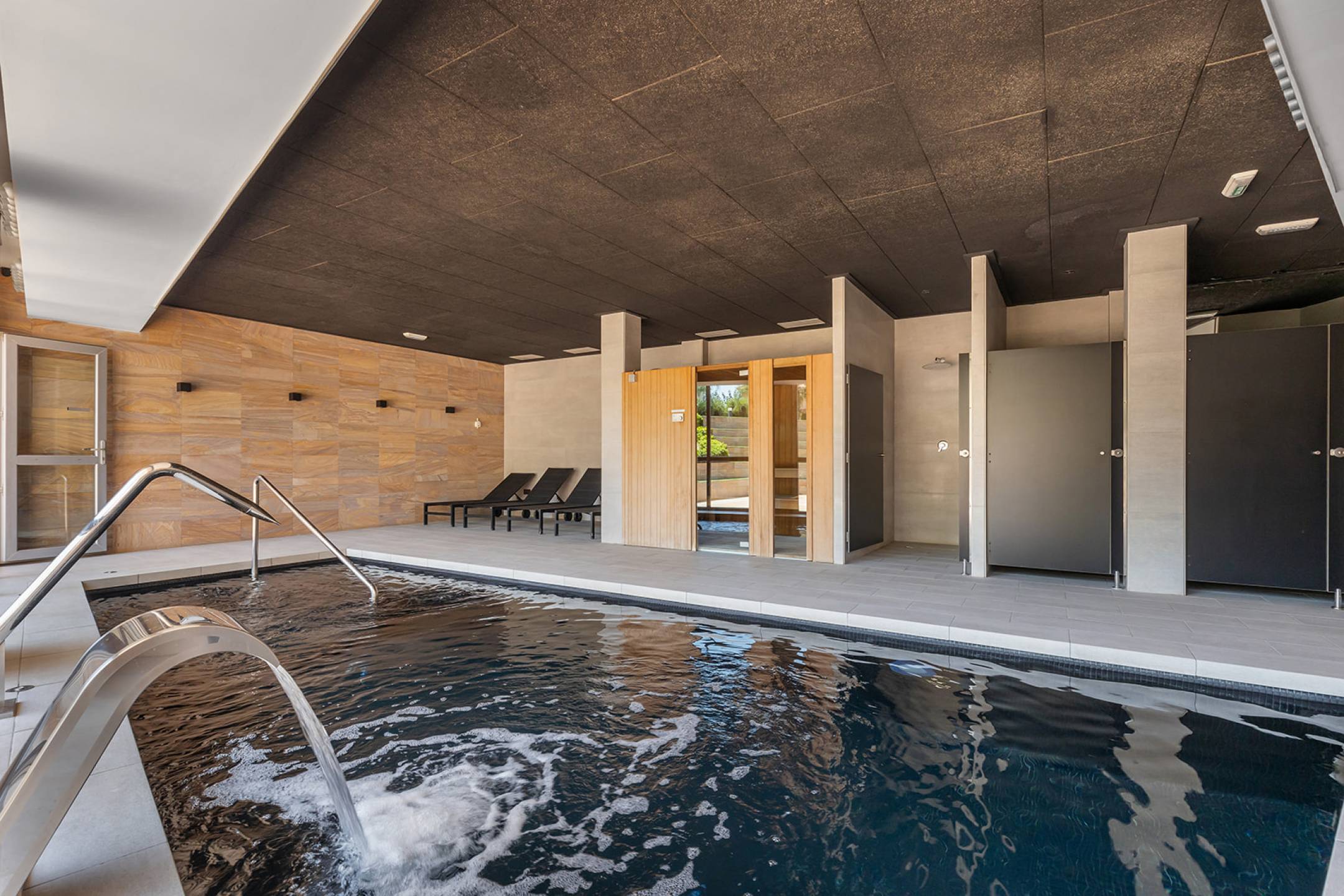 Inside, the property has an open-plan design with a luxury finish. Textured wall panelling adds depth and character throughout, creating a refined and distinctive atmosphere.