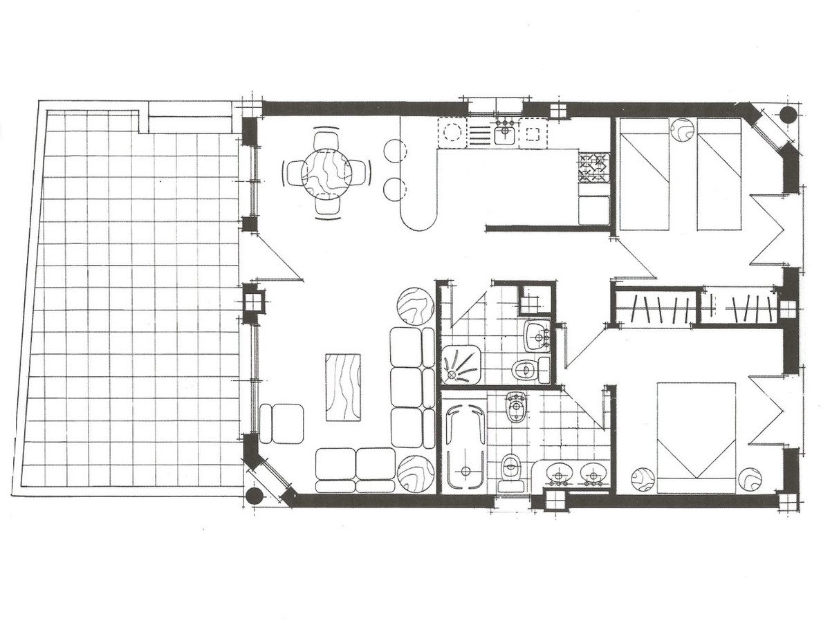 At the front, a welcoming sunny terrace extends the living space, equipped with a sun awning for year-round enjoyment. From here, you enter the bright lounge–dining area, which connects seamlessly to the open-plan kitchen, creating an inviting and functional central living space.