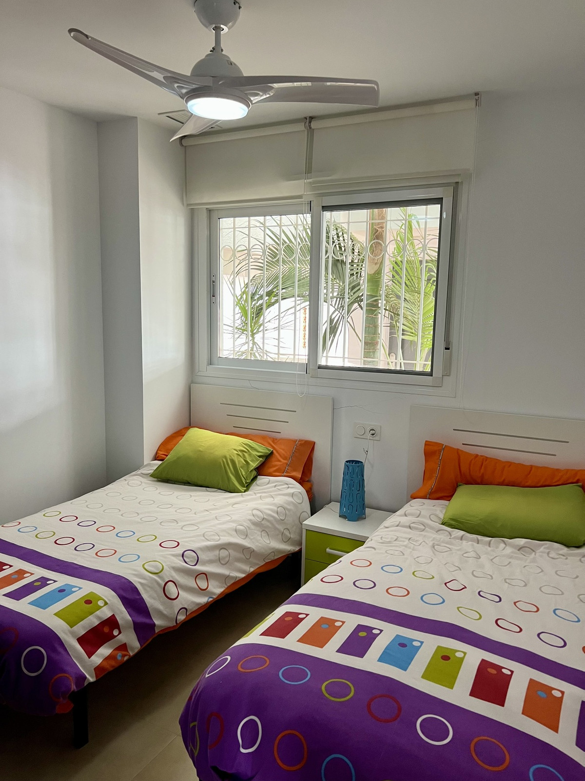 The apartment is bright and well laid out with an open plan living/dining room and fully equipped kitchen, two bedroom with fitted wardrobes, two bathrooms, and a sunny balcony. There is an intercom system to the street, air conditioning (hot/cold) throughout the property and the community is gated with attractive gardens and large impressive communal garden and swimming pool. Allocated parking space and storage room in the garage is also included in the price.
