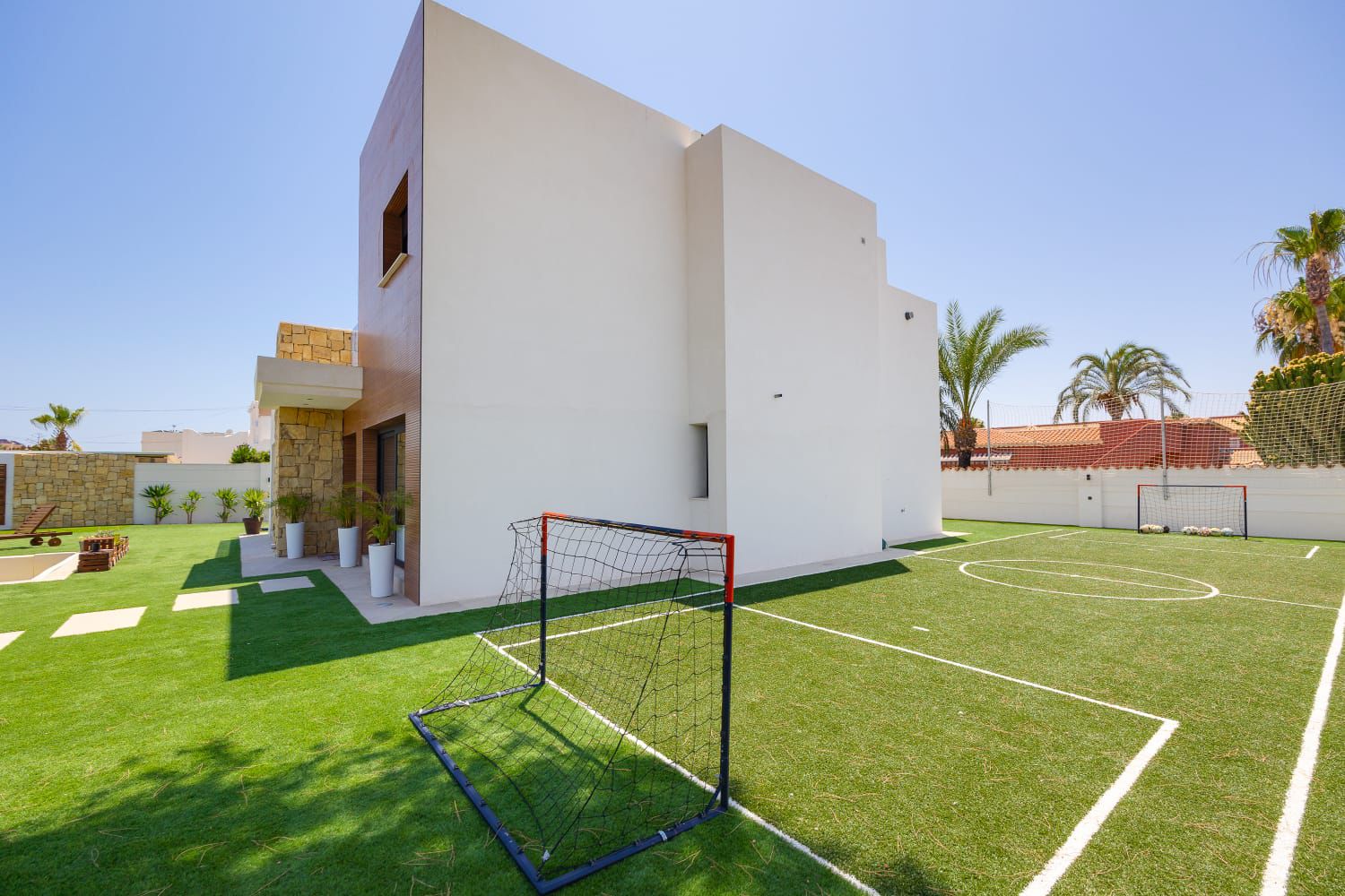The exterior is nothing short of spectacular, designed to enjoy the Costa Blanca lifestyle year-round: Saltwater swimming pool with waterfall feature, Private mini football/soccer pitch, Sunken conversation pit, perfect for evening gatherings, Multiple outdoor dining and lounge areas, Fully equipped barbecue area, Manicured gardens and sunny terraces.
