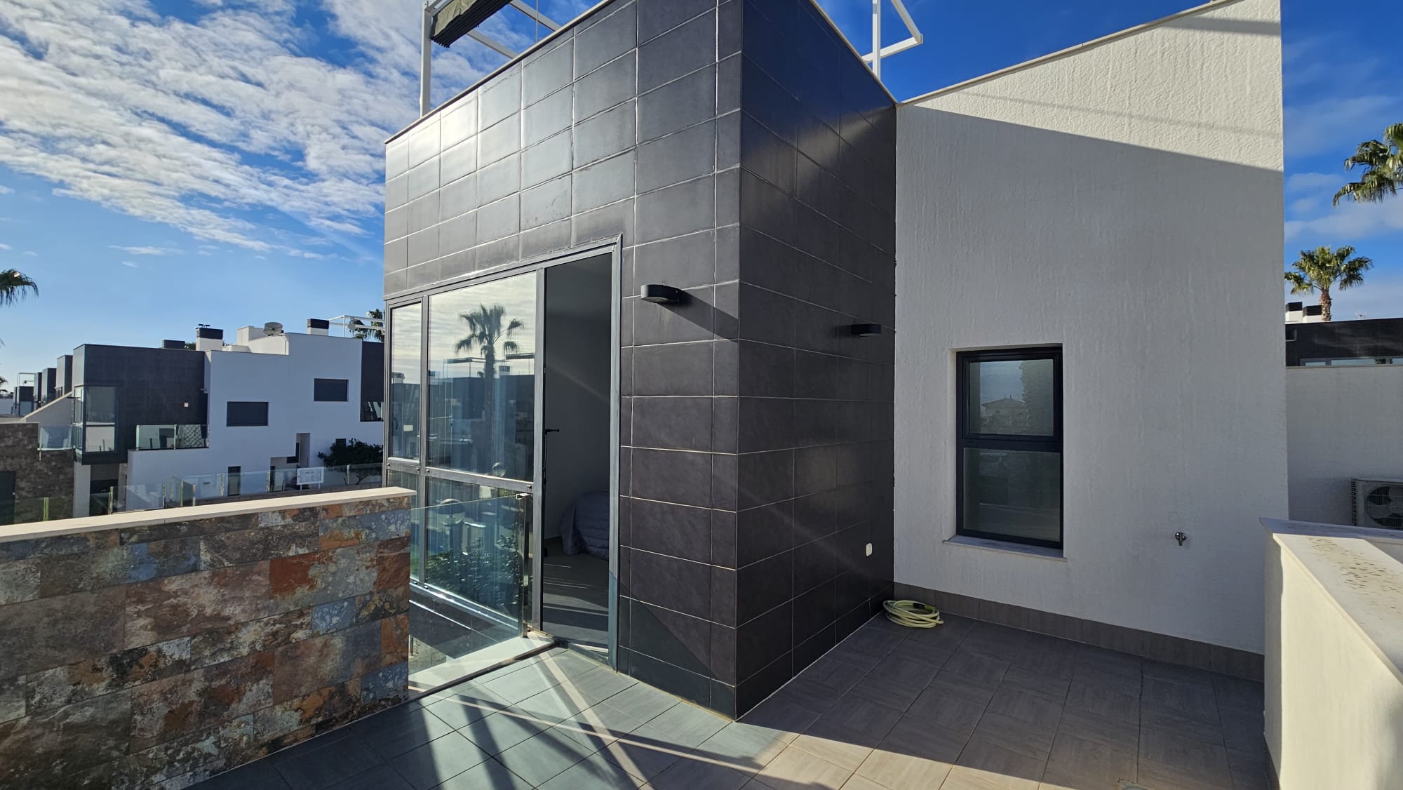 This beautifully designed modern semi-detached home offers refined living with open sea views enjoyed from an elevated, tranquil setting. Positioned overlooking one of two community swimming pools and located just steps away, the home features three elegant bedrooms and two bathrooms, thoughtfully arranged for comfort and functionality. A bright and versatile solarium enhances the living space, providing an ideal area to relax or entertain while enjoying the surrounding outlook. Residents benefit from access to two immaculate communal pools, along with the convenience of a private underground parking space and an additional driveway directly in front of the home. Additional features include air conditioning throughout, heated floors, and thoughtfully designed outdoor spaces, combining comfort, style, and practicality. Perfectly located, the property is within easy reach of supermarkets, bars, and restaurants, ensuring everyday convenience and vibrant lifestyle options. With clean architectural lines, quality finishes, and a well-balanced layout, this property is ideal as a primary residence or a stylish retreat, offering modern luxury, space, and views without coastal exposure.