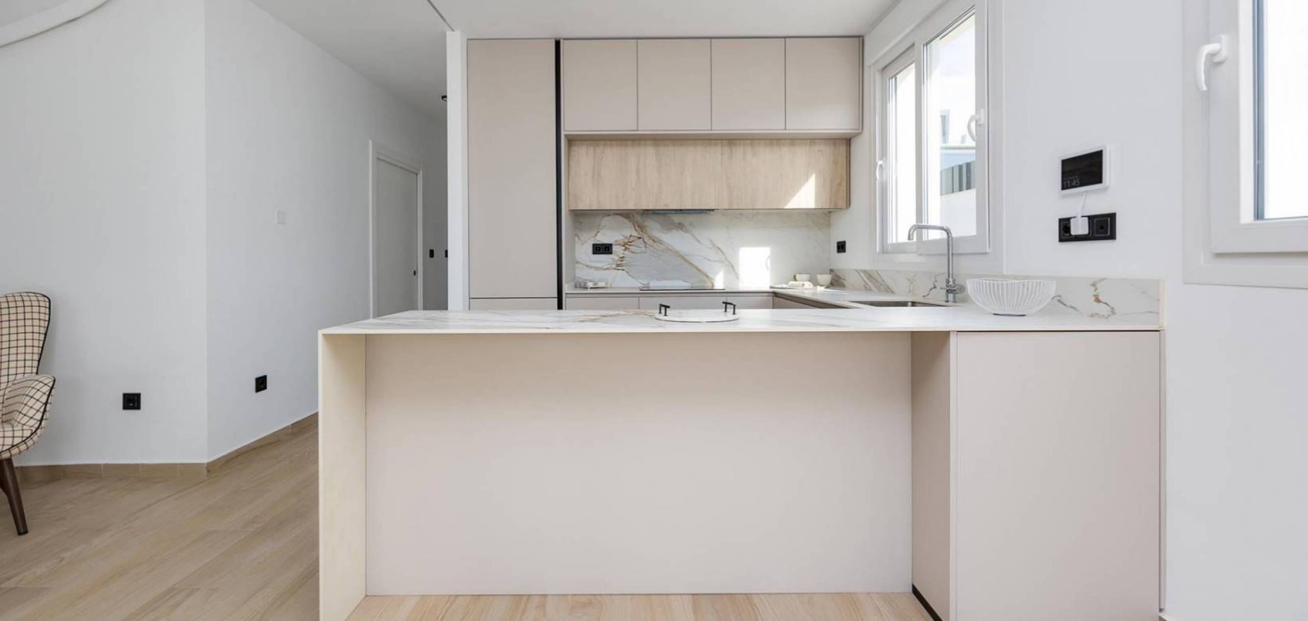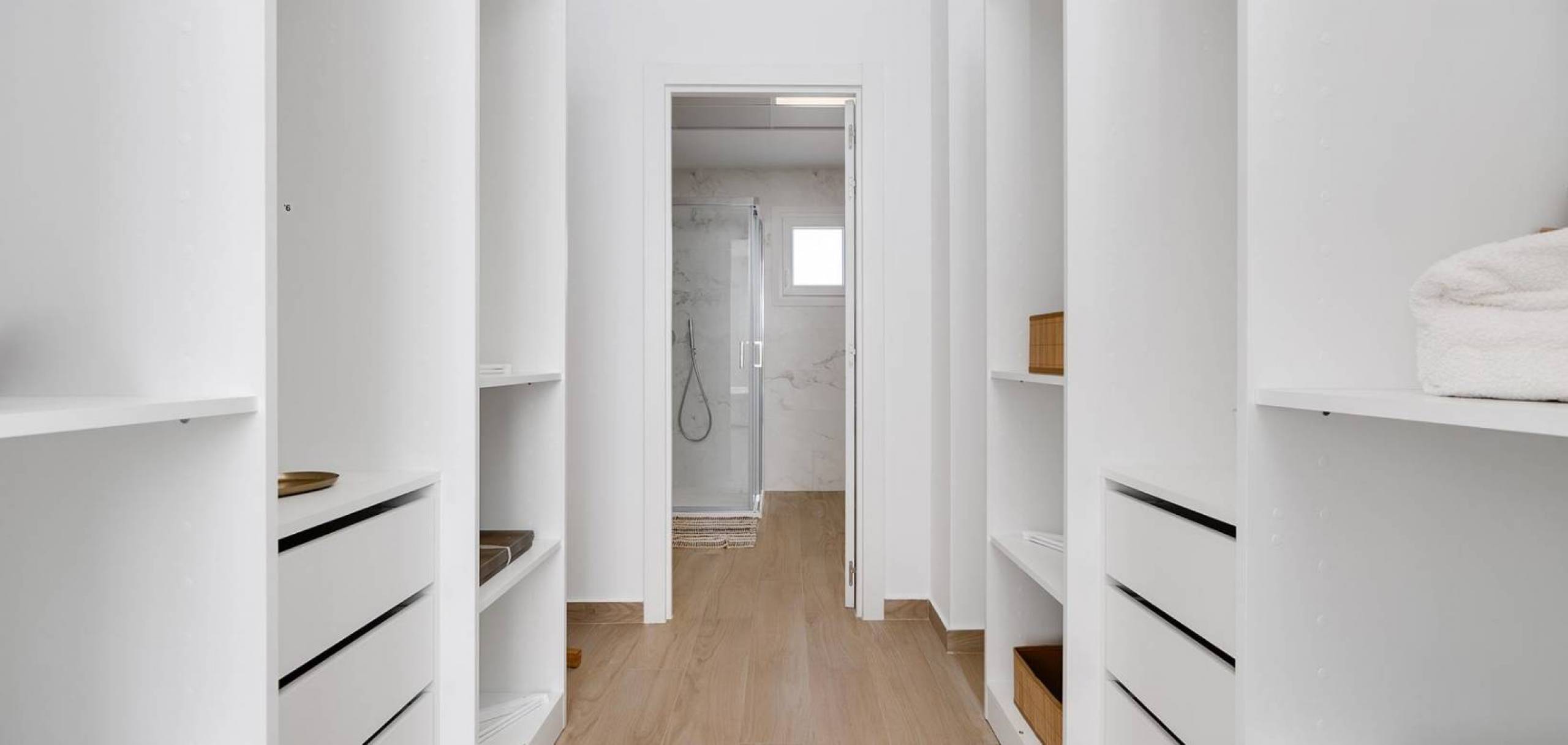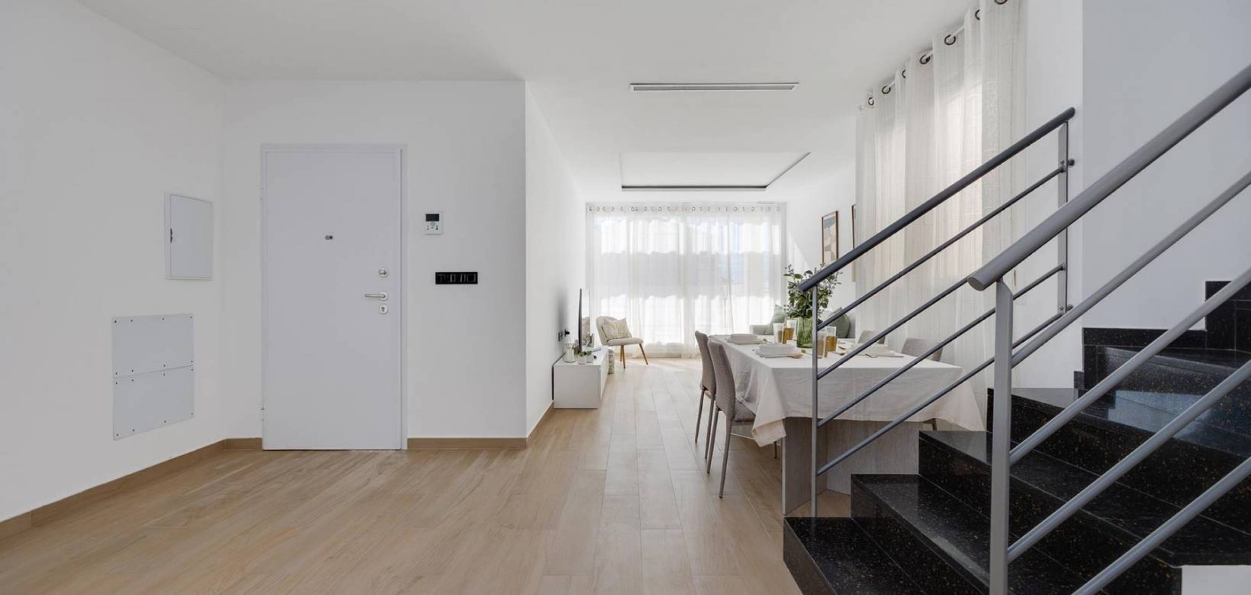 The property sits on a private plot of 407 m² and has a total built area of 120 m², with additional terrace space of 60 m². The layout is straightforward and functional. On the ground floor, the main living area combines lounge, dining space and kitchen in an open and bright setting, complemented by two bedrooms and a bathroom. The upper floor is reserved for the main bedroom, which includes a dressing area, en-suite bathroom and direct access to a private terrace overlooking the surrounding residential area.