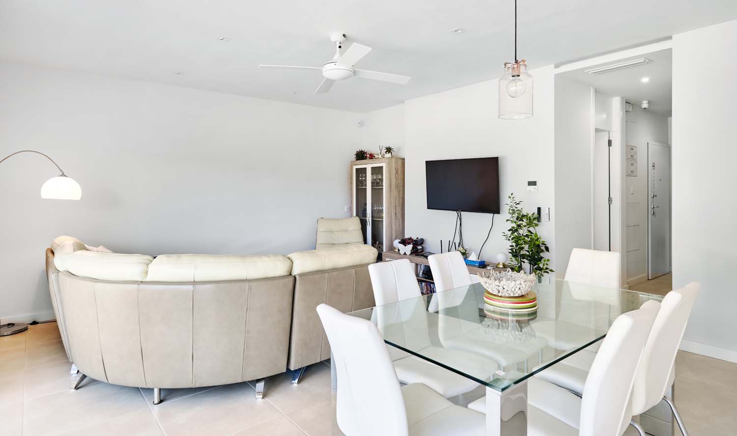 Entering into the apartment via the front door, you are greeted by a light and bright entrance hall, to the left hand side is the master bedroom which is a good sized room with built in wardrobes, there is a double height windows which floods the room with natural light and look out to a terrace area at the side of the apartment. The master bedroom also benefits from a beautiful en suite bathroom with walk in shower. Heading back to the entrance hallway leads to the second bathroom which also has a walk in shower and the second and third bedrooms both with built in wardrobes. The spacious open plan living/dining room is located at the end of the hallway, this space benefits from large sliding patio doors which give lots of natural light but also connect the inside with the terrace, meaning the lovely views can be enjoyed from the living room too. The kitchen is located to the left of the living room it is fully fitted with modern units and there is a door leading out to that side terrace.