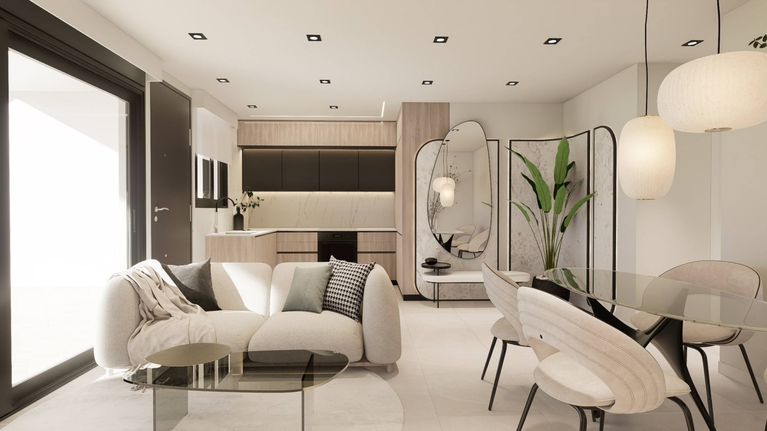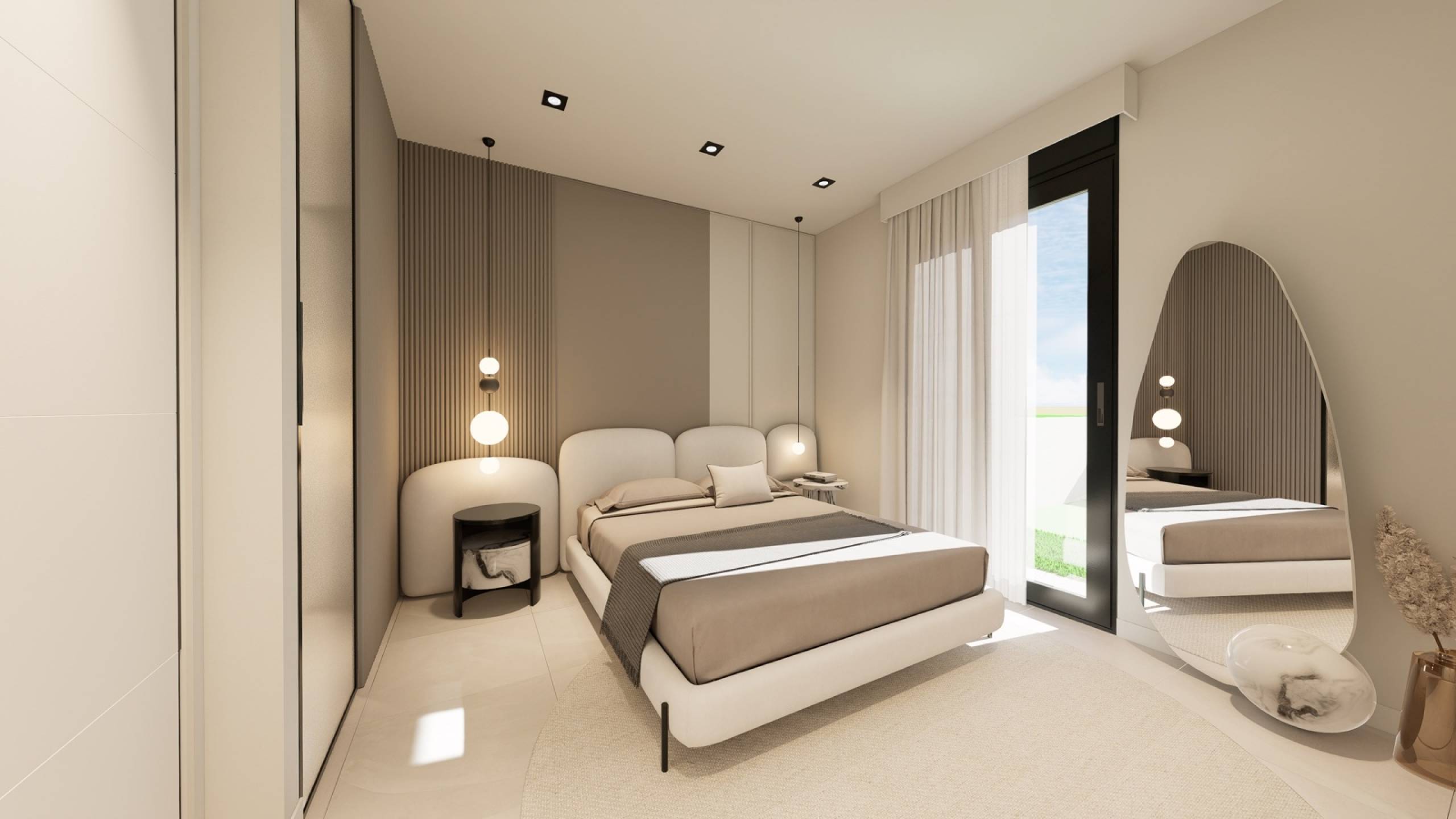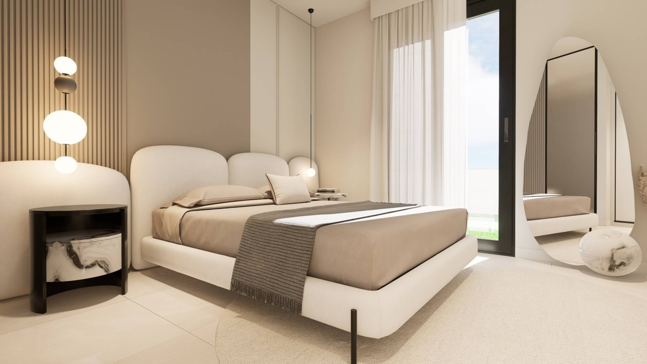 The homes are available in two different layouts. Ground-floor properties feature a private garden, while the upper-floor homes offer a spacious private solarium. All properties benefit from a south-facing orientation, providing abundant natural light and sunshine for most of the year. Each bungalow includes two bedrooms and two bathrooms, along with an open-plan kitchen and living area that connects directly to the terrace, creating a comfortable indoor–outdoor living space suited to the Mediterranean climate.