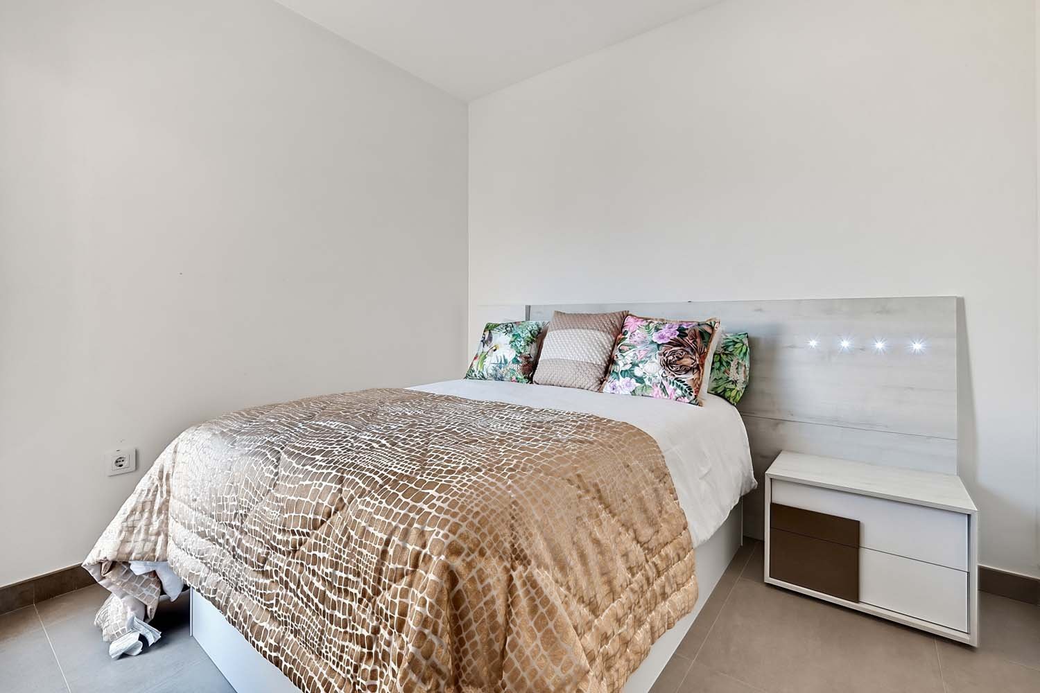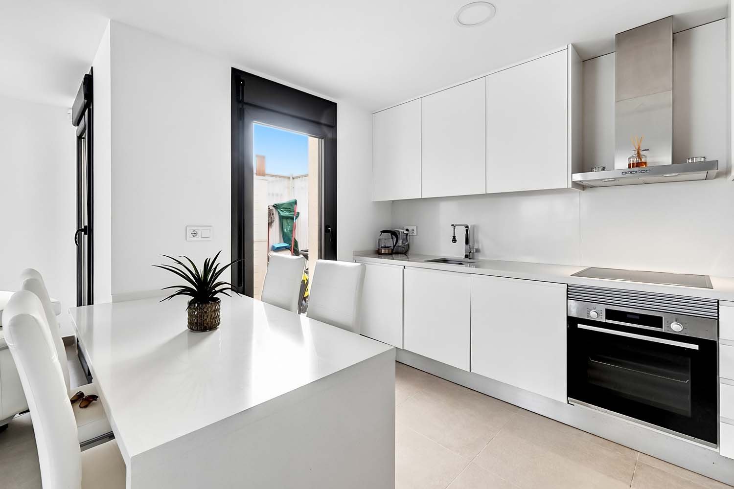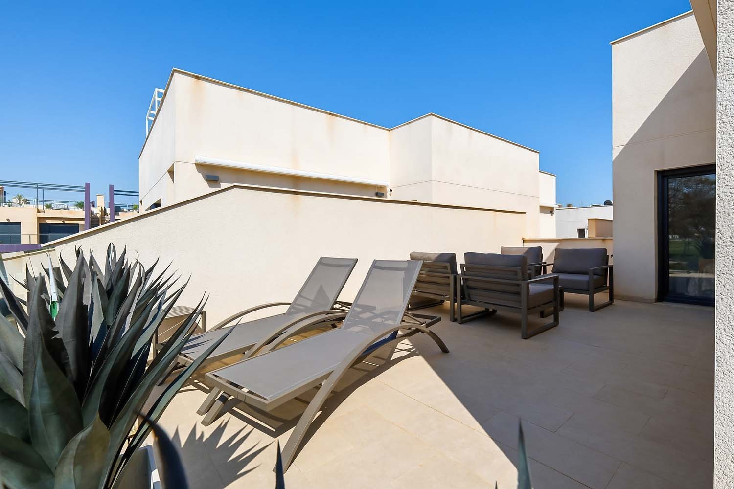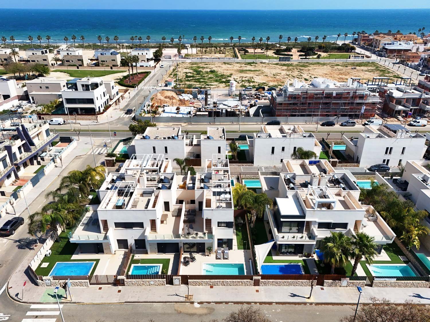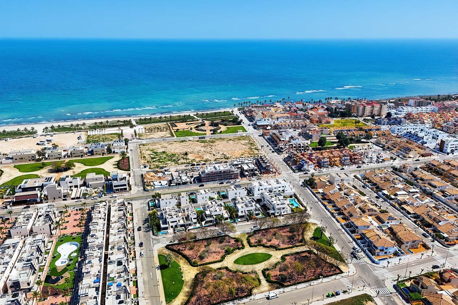 Contemporary Semi-detached villa Overlooking Green Parkland – Marketed exclusively by Horadada HomesThis exclusive residential is characterized by its fantastic location, located just a few meters from the beach of “Las Higuericas” in Torre de la Horadada and its spectacular views to the sea.Designed with both comfort and functionality in mind, the property boasts a well-balanced layout and bright interiors, complemented by its own private swimming pool and inviting outdoor spaces—perfect for enjoying the Mediterranean climate year-round.The main living area is arranged in a bright open-concept layout, seamlessly connecting the lounge, dining area, and fully fitted kitchen. Large windows and sliding doors flood the space with natural light while creating a strong connection to the outdoor areas.On the ground-floor, the villa features a spacious double bedroom and a modern bathroom. This bedroom enjoys direct views of the pool and private outdoor area, with convenient access leading straight outside—ideal for guests or embracing effortless indoor-outdoor living.Upstairs, two additional bedrooms provide comfortable accommodation, along with a second bathroom finished to an very high standard indeed.A key highlight of this home is its open orientation facing landscaped parkland. With no properties directly in front, the villa benefits from uninterrupted green views, enhanced privacy, and a calm, relaxing atmosphere.Outdoor living is a true standout feature. In addition to the garden and terrace, the property boasts a private rooftop solarium complete with a fully fitted summer kitchen, marble dining table, and seating area—all crafted from high-quality, weather-resistant materials designed for durability and year-round enjoyment. From here, you can relax, entertain, and take in sea views in complete comfort.This villa also benifits from a private parking space.Whether you’re searching for a permanent residence, a holiday escape, or a smart investment, this villa delivers an exceptional combination of modern design, quality finishes, and an enviable location.
