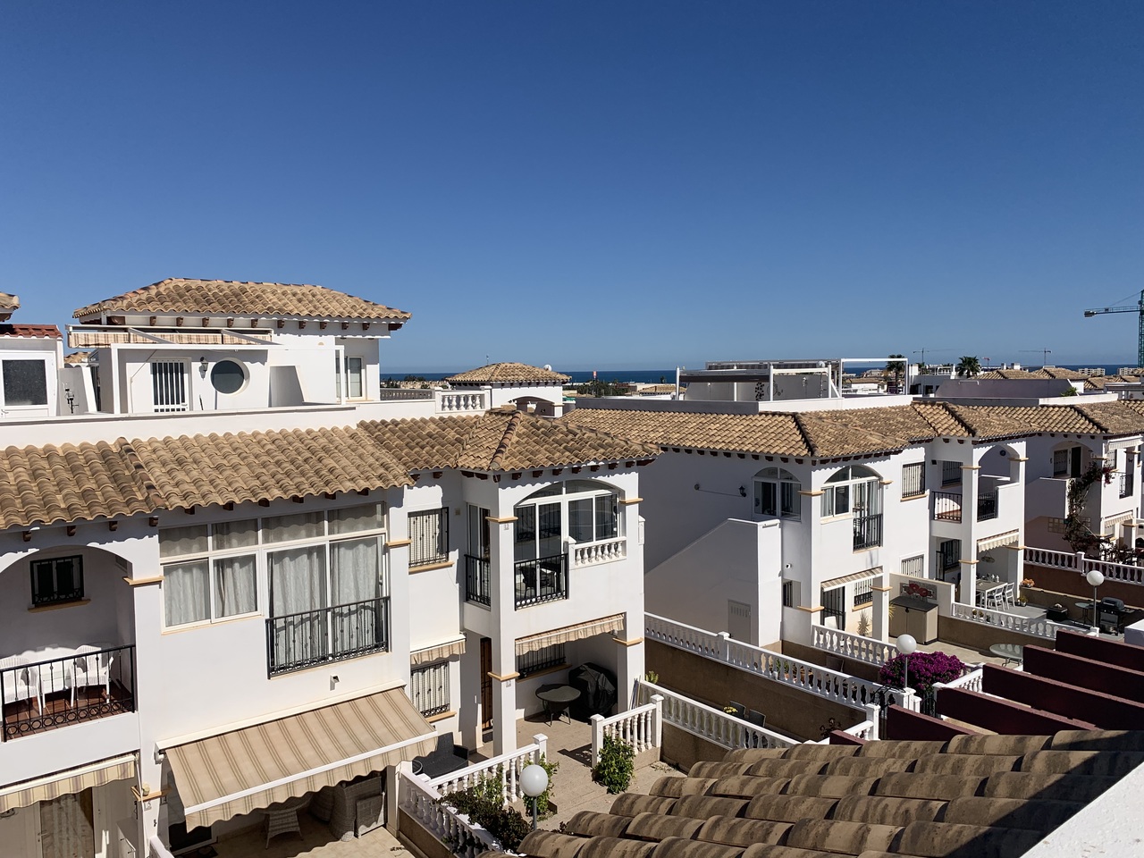 Stunning 2 Bedroom Townhouse in La Cinuelica R15, Punta PrimaDiscover the charm of this stunning 2 bedroom townhouse located in the desirable La Cinuelica R15, Punta Prima. This property boasts a spacious front garden, perfect for outdoor relaxation and entertaining friends and family. The gated secure complex offers peace of mind, complemented by beautiful communal gardens and two inviting community pools, ideal for those warm summer days.Step inside to find an open-plan living and dining area, featuring a fitted ceiling fan for added comfort. The generously-sized double bedrooms come with fitted wardrobes, providing ample storage space. The main bathroom is well-equipped with a shower, bath, bidet, and sink, ensuring convenience for all residents. Enjoy morning coffee on the front balcony accessible from the main bedroom or soak up the sun on the large solarium with stunning sea views.This townhouse is just a stone’s throw away from beautiful beaches, vibrant bars, restaurants, and local shops, making it an ideal location for those who love the coastal lifestyle. While the property requires a new kitchen to personalise it to your taste, it presents a fantastic opportunity to create your dream home in a sought-after area. With reasonable community fees of just 500 Euros per year and an additional Suma of 250 Euros annually, this is a chance not to be missed.Schedule a viewing today and start envisioning your new life in the picturesque Punta Prima!