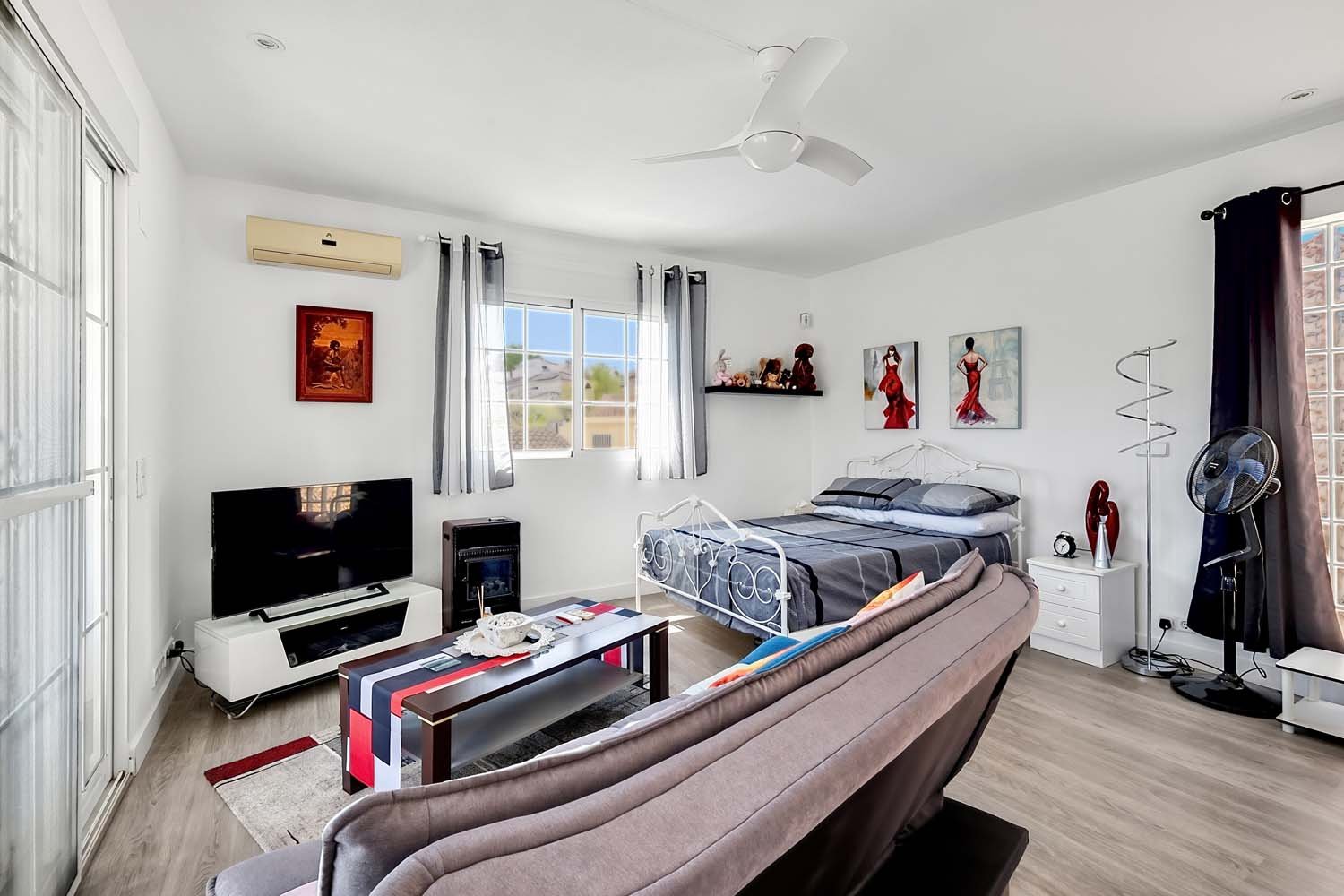 External stairs lead to the upper level which hosts a self-contained guest apartment, comprising a large bedroom with space for a seating area, kitchenette, and bathroom. There are patio doors opening out to a large private terrace offering lovely views across orange groves and towards the sea.