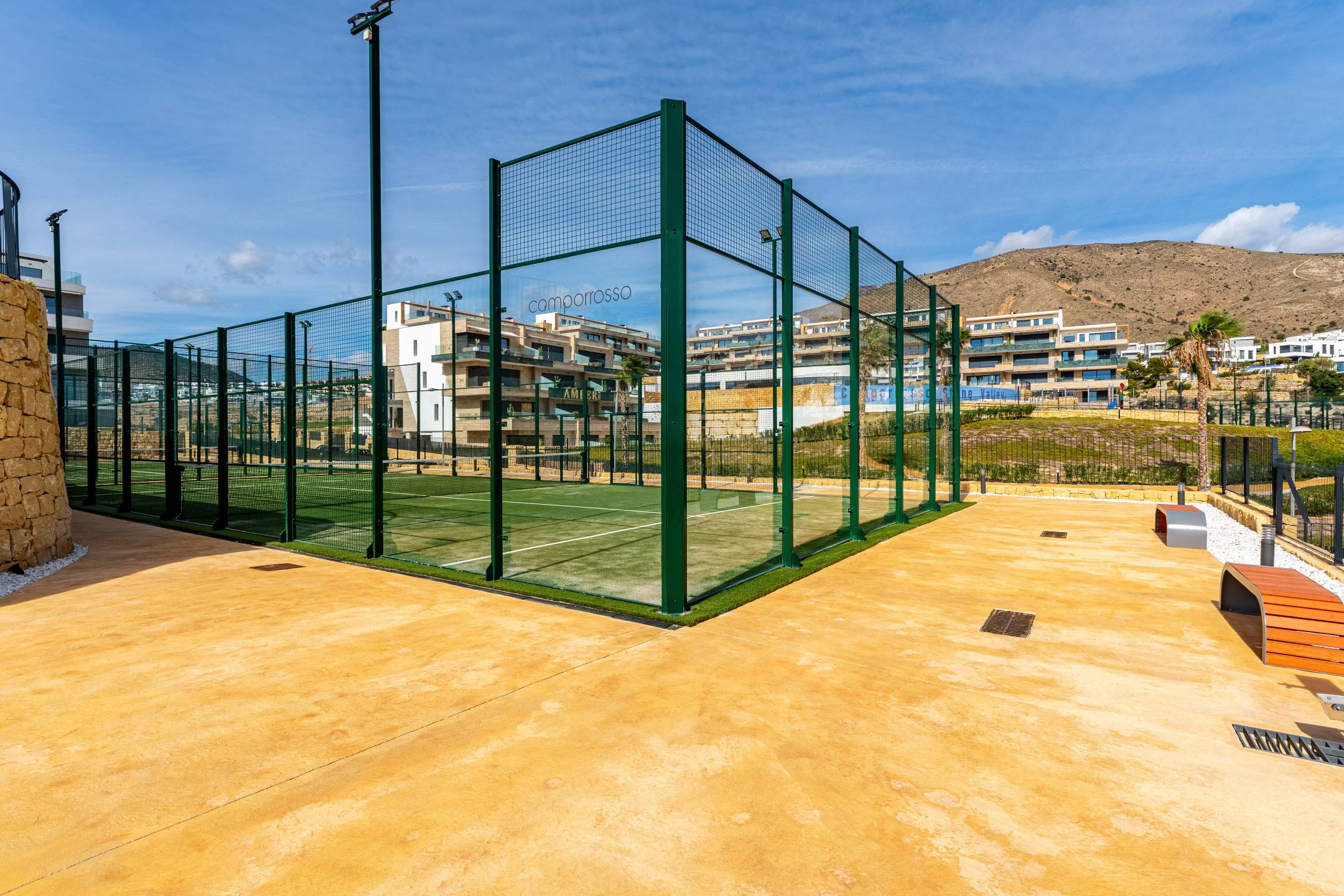At the centre of the project is a landscaped green corridor shaped in a gentle “serpentine”, creating space for walking, cycling and outdoor living. On one side, the environment takes on a more natural character with elements of Mediterranean woodland, while terraced gardens with climbing plants, shrubs and bougainvillea define the surroundings. Communal areas follow the established standard of Camporrosso, offering an infinity pool, indoor pool, gym, spa with jacuzzi and sauna, paddle courts, as well as co-working and meeting spaces. The setting supports both relaxation and a more active lifestyle.