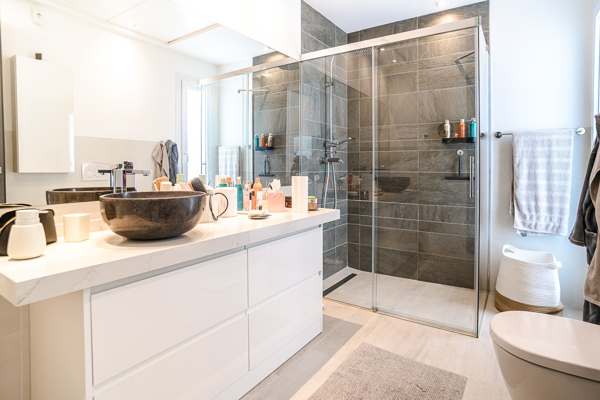 Binnen vindt u drie ruime slaapkamers met praktische kasten. De master suite beschikt over een eigen kleedruimte en een luxe en-suite badkamer. Daarnaast is er een tweede complete badkamer en een apart gastentoilet, allemaal hoogwaardig afgewerkt met moderne, kwalitatieve materialen.