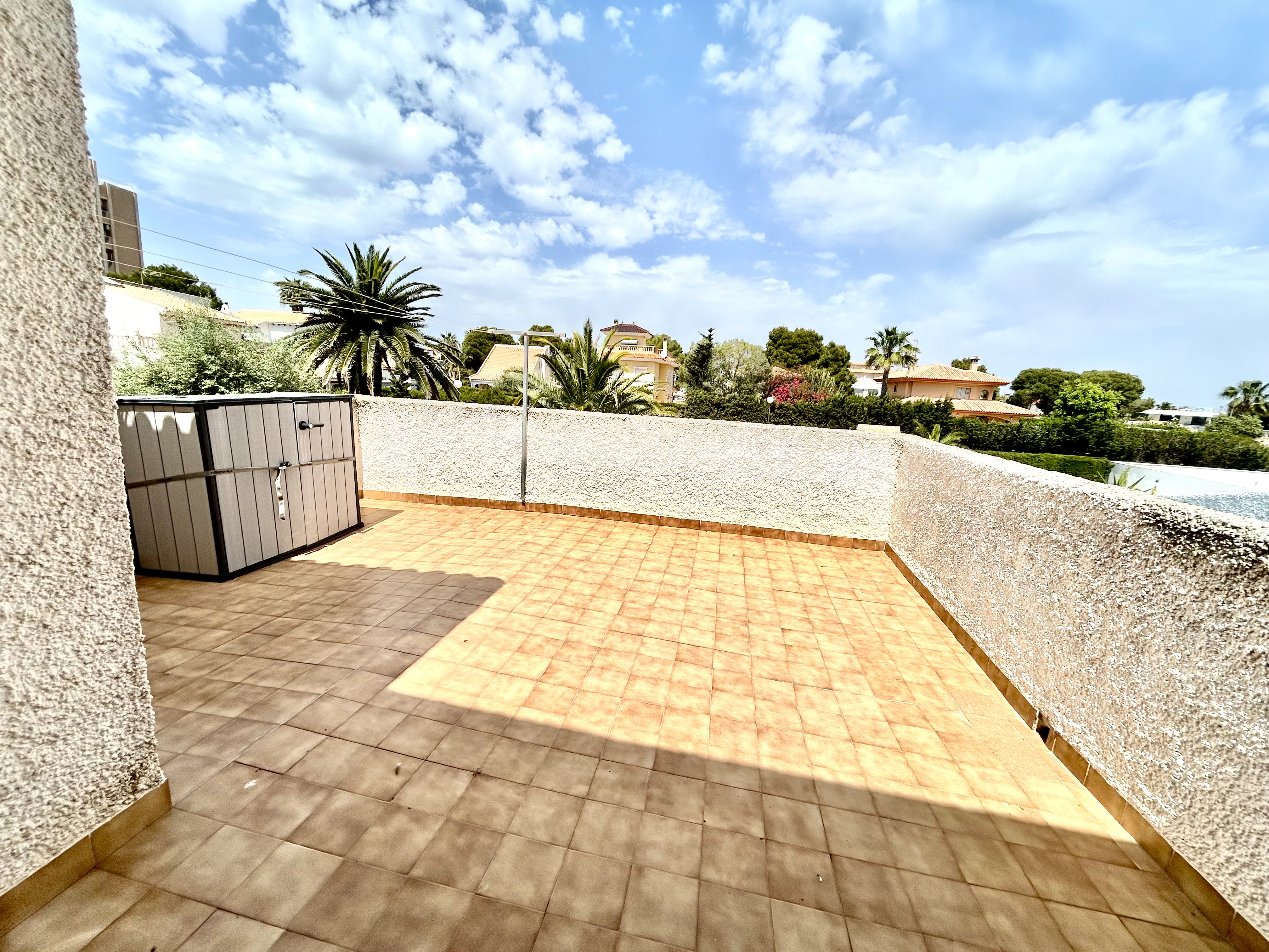 Inside, the home features three well-sized bedrooms and two modern bathrooms, designed for comfortable living. One of its highlights is the large private solarium, offering an ideal space for sunbathing, entertaining, or simply enjoying the views throughout the day.